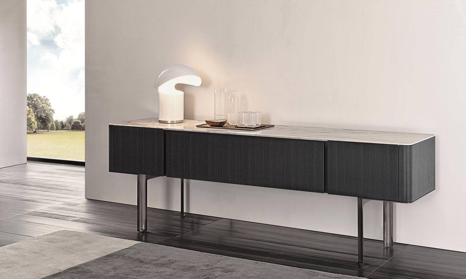 Christophe Delcourt interpreted the more decorative aspect of Minotti with the 2017 debut of the Lou collection – storage units, tables and coffee tables – the Fil Noir armchair and the Noor coffee table.
