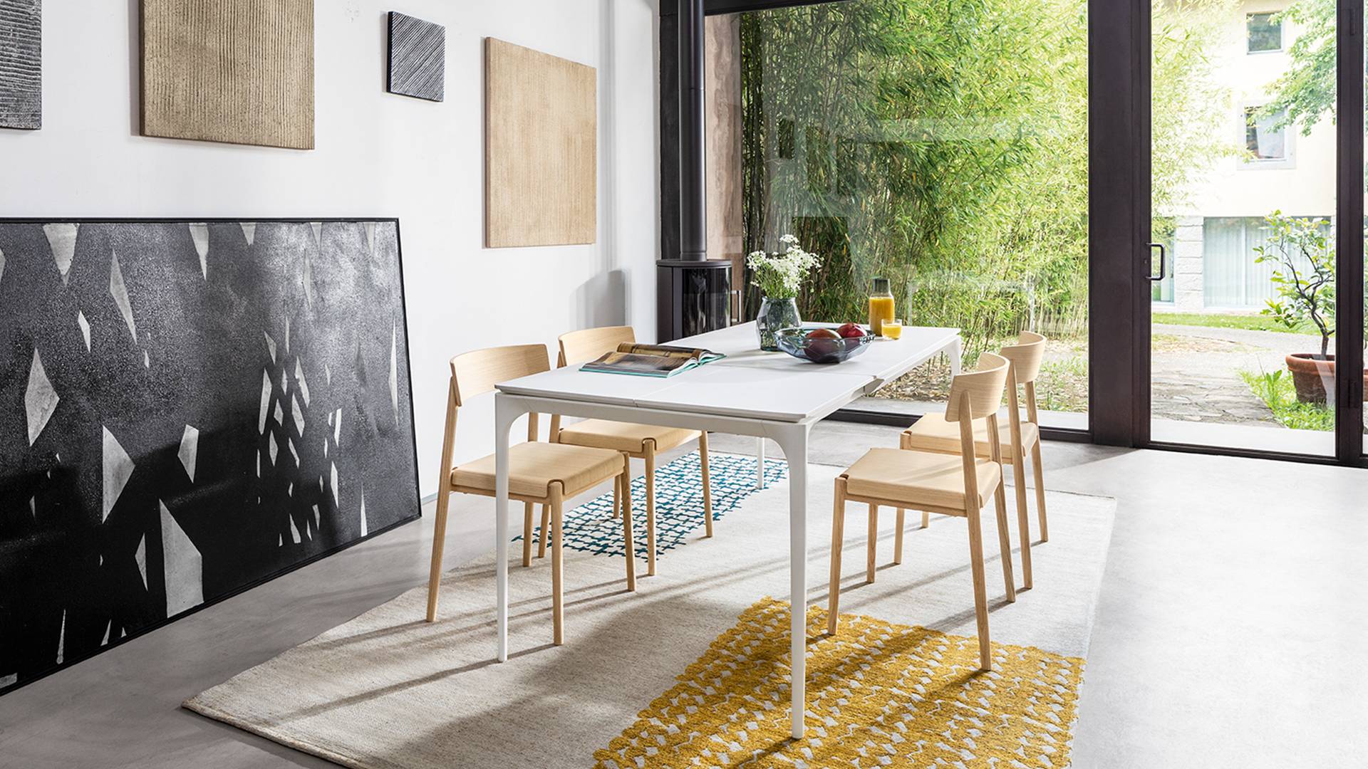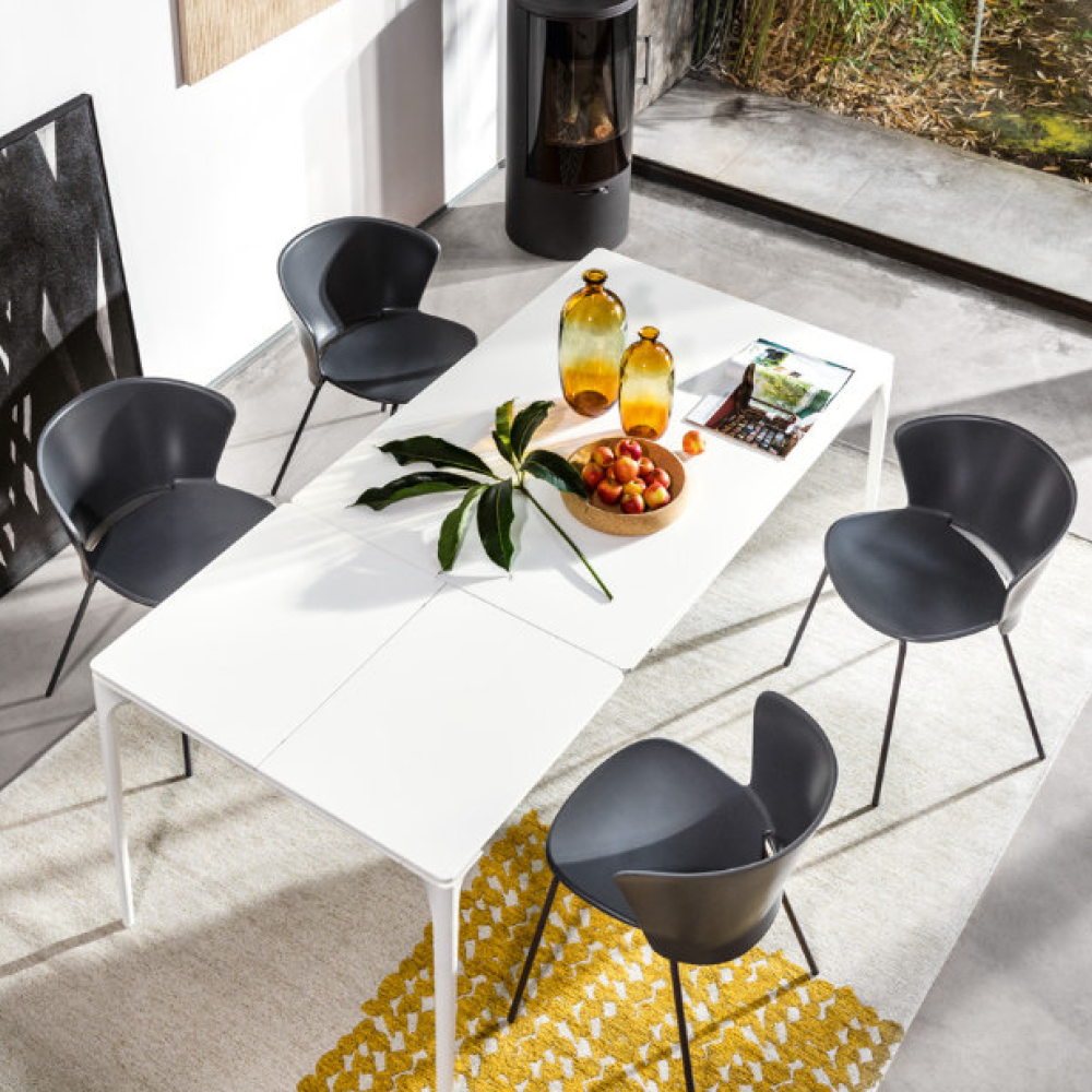SILHOUETTE is an extendable table with a sophisticated minimalist design, softly rounded edges and a slender frame in coated aluminium with a top available both in wood and in ceramic.