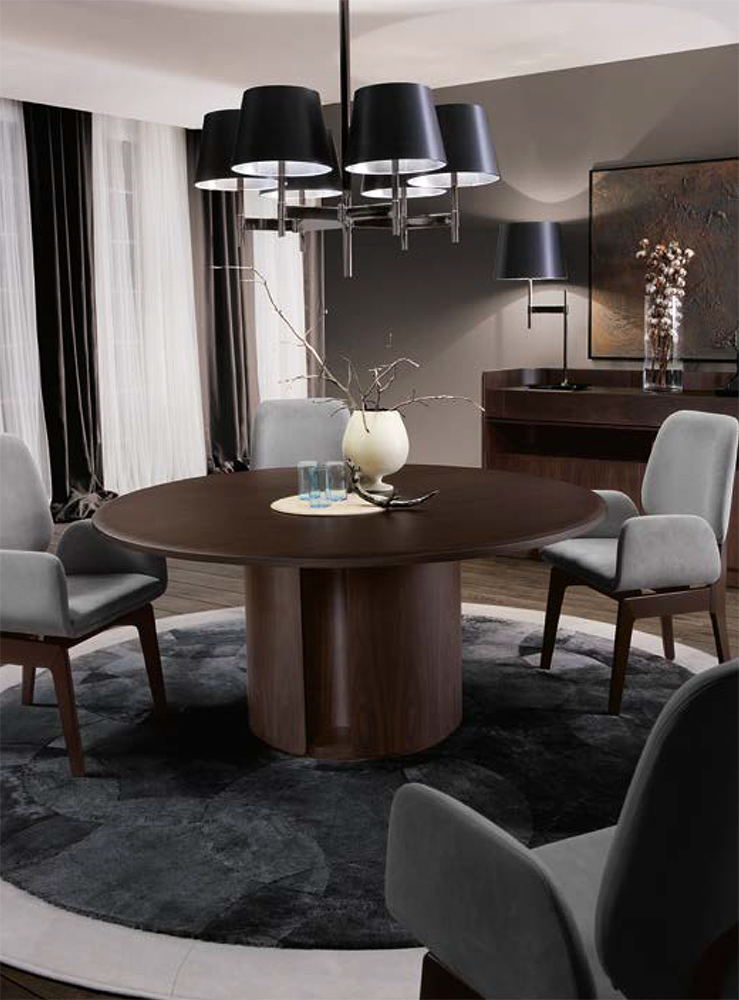 Byron Round is the refined dualism of wood and leather that perfectly integrates with the furniture for modern halls that also expresses classic style. This table is the protagonist of the environment it is placed in: its rounded and refined aesthetics stands out enhancing the rest of the space.