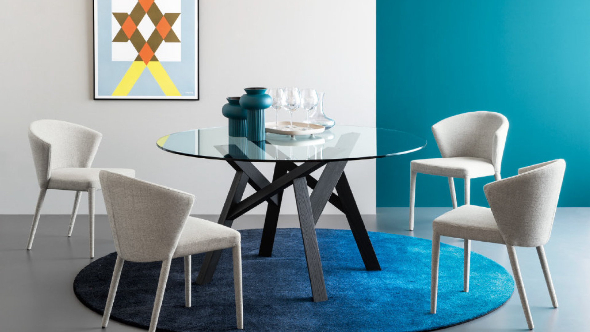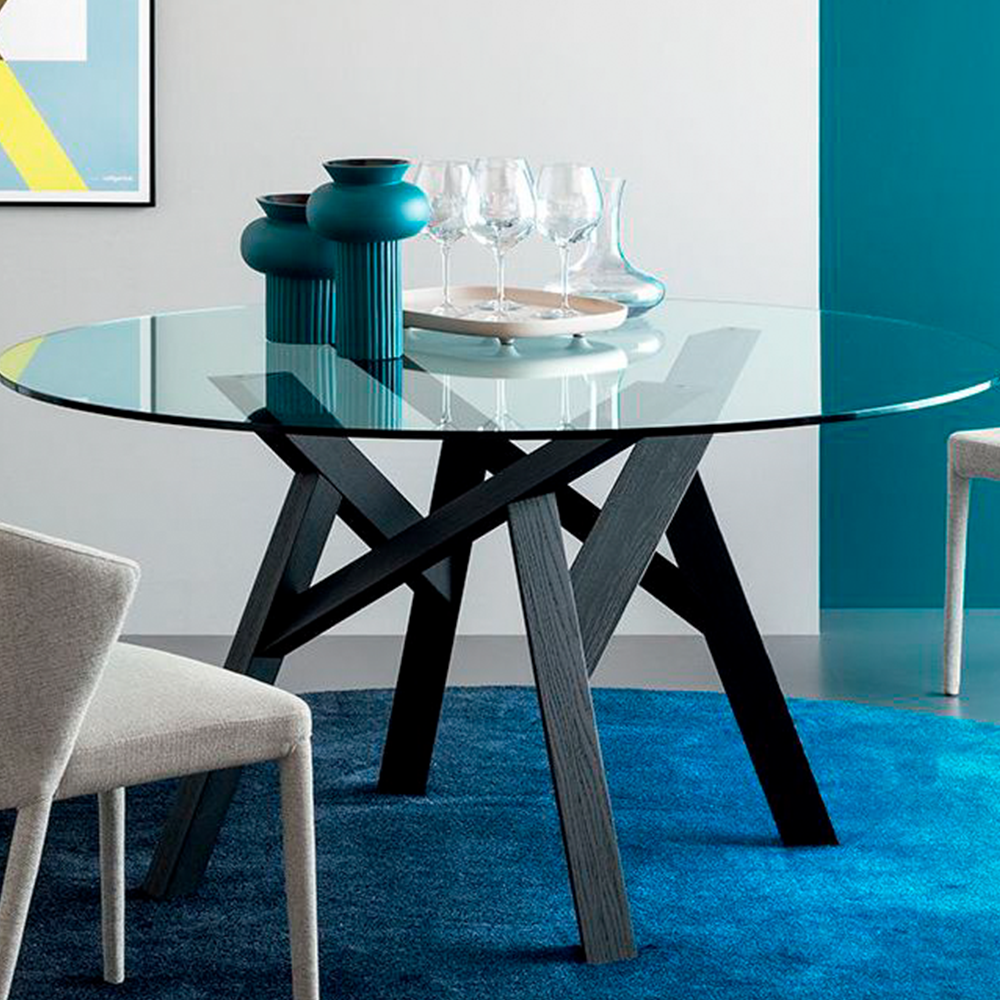 JUNGLE is a non-extending round table which is part of the homonymous set of tables whose hallmark is the four-legged base structure in solid ash with a triangular section. The legs seem to intertwine like tree branches or thin trunks in tropical jungles. The wood on the frame and the table top in glass or ceramic create an interesting aesthetic contrast which makes this table astoundingly elegant and incredibly unique.