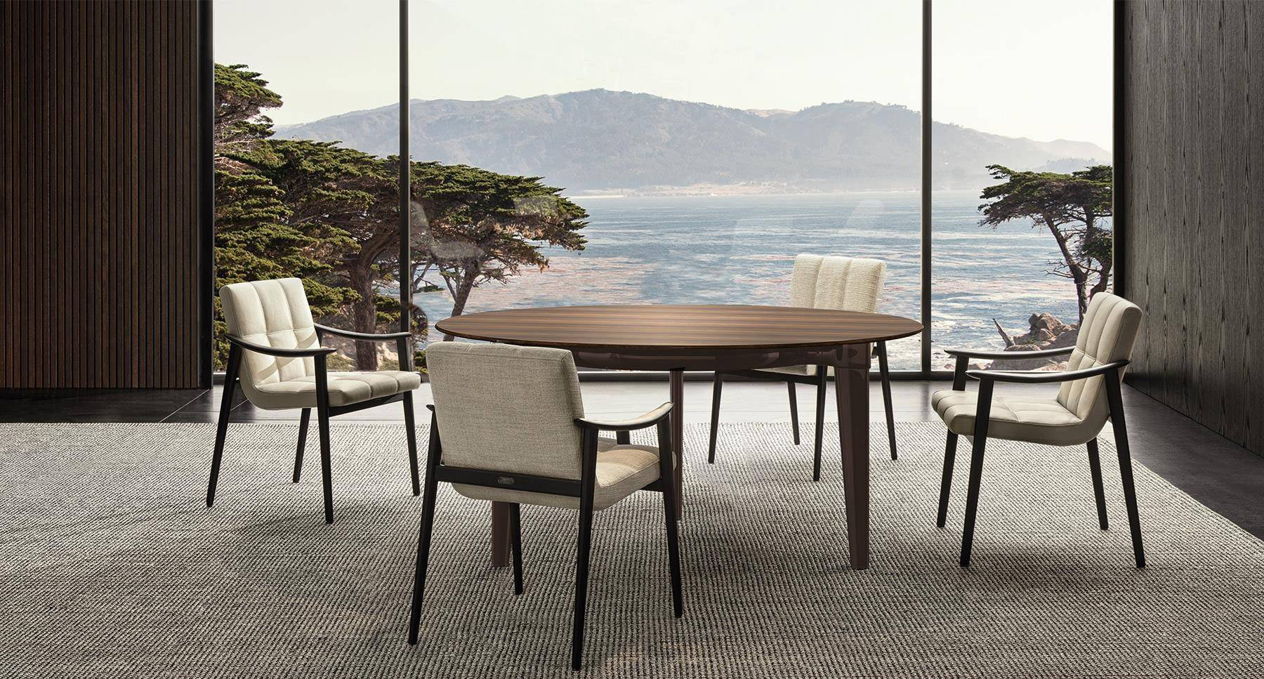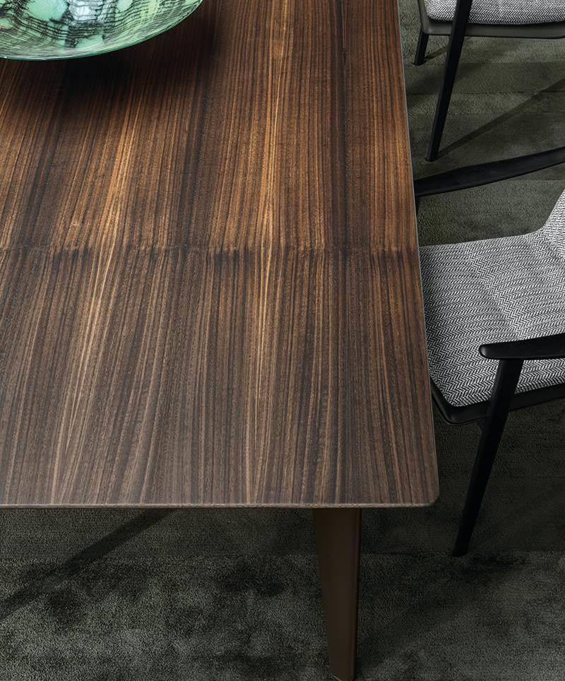 The colour of the legs in polished Pewter and the choice of a textured, pictorial wood define its sophisticated elegance, revealing an apparently minimalist, linear design. The tapered leg, also featured on the outdoor Terrace table designed by Rodolfo Dordoni, endows the piece with dynamism and a sensation of absolute lightness.
