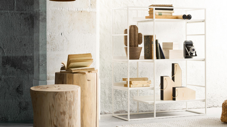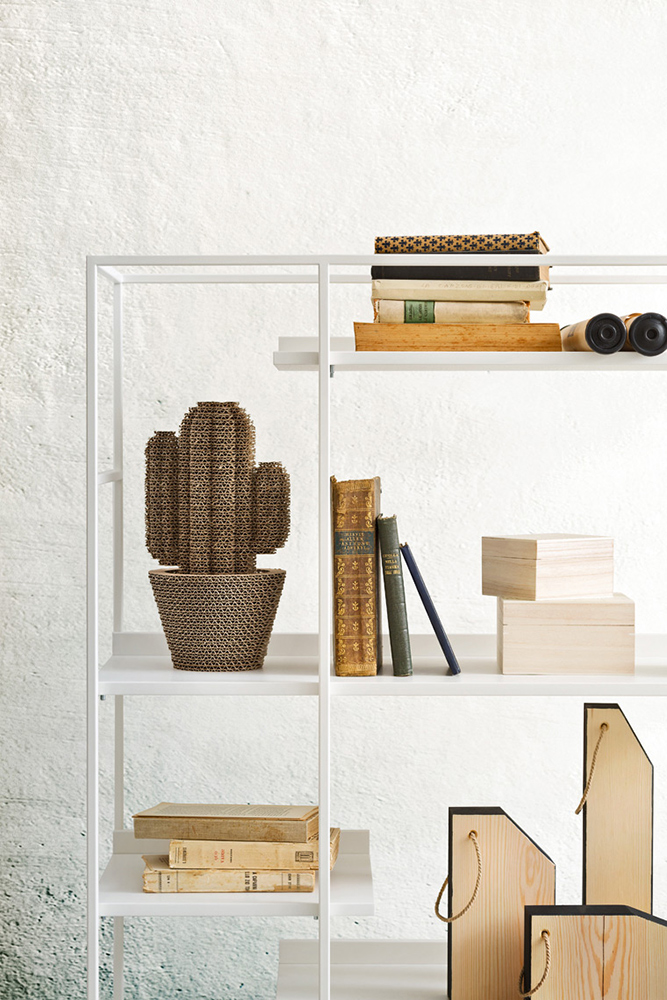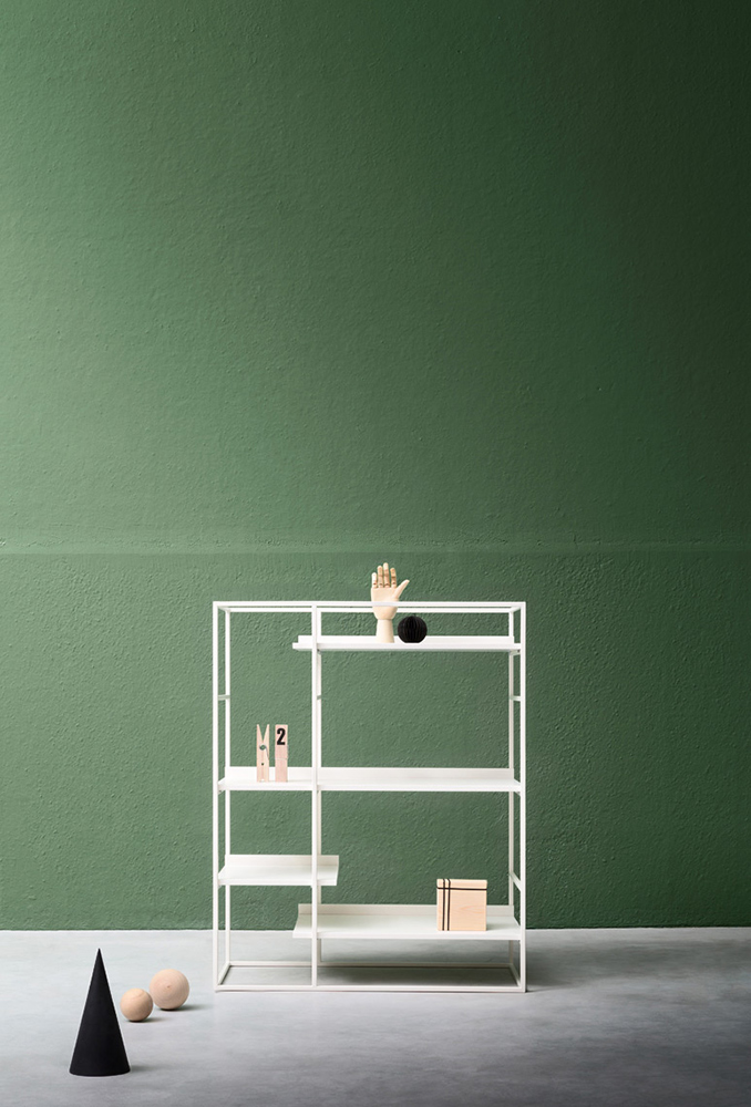 The Up bookcase has a painted metal structure and shelves which are available in various wood finishes or lacquer colours. Up is available in three configurations.