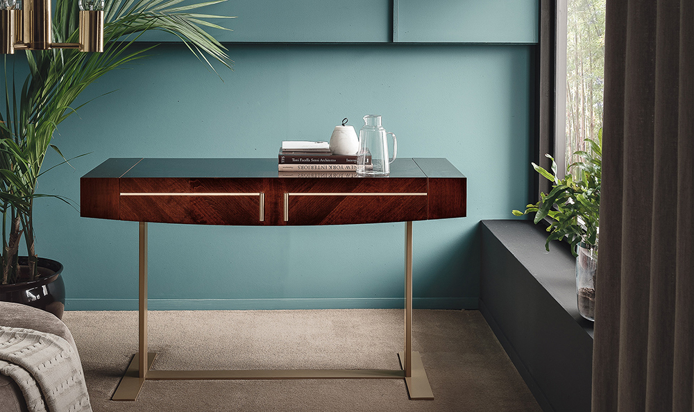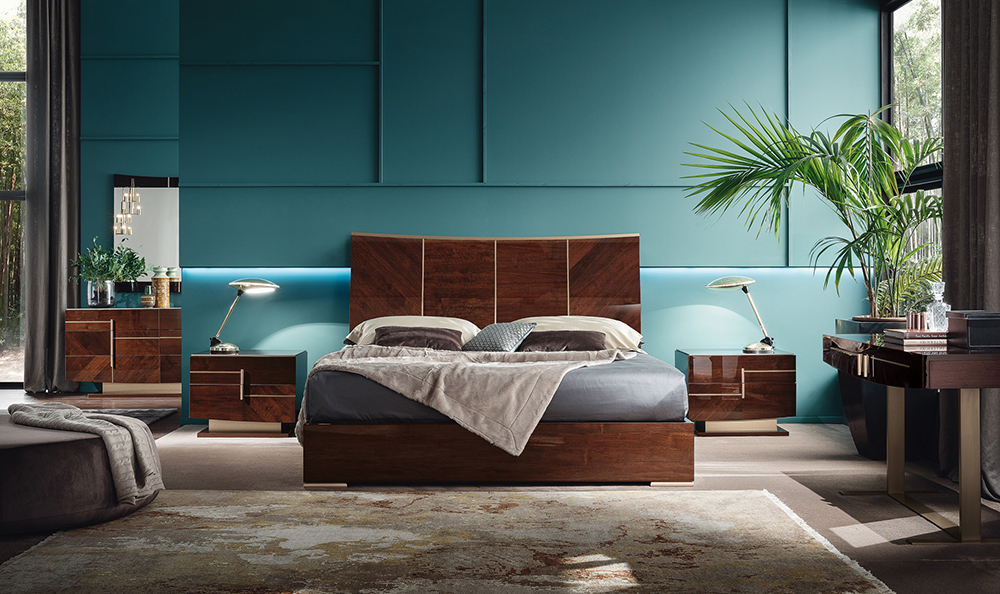 The Bellagio Bedroom Set is a truly gorgeous collection that emphasizes luxury design. The modern Bellagio platform bed features a Coffee Walnut High Gloss finish, a smooth glossy style with crisp and rose gold lines. The way the wood grain shows in this collection is truly beautiful. The headboard features a sweeping crown top. This collection is composed of a matching nightstand, dresser, mirror, tall chest, wardrobe, vanity, and chair.