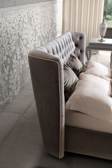 Caravaggio`s classical outline is painted by the conscious involvement of its eloquent finishes. The edge`s clear-cut identity defines with marked strokes the overflowing liveliness of the headboard, which, by bending at the sides, increases the dynamism of a luxurious and refined capitonné.