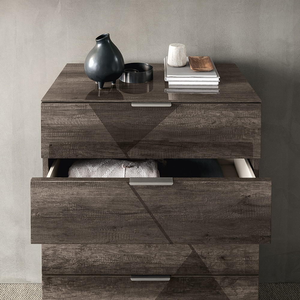 Made of real wood veneer and covered with Rim surfaced oak Gloss veneer, the furniture lasts long and looks really amazing. Platform Bed Favignana is offered in three sizes: queen, king, and California king. There is also a complete set of case goods: nightstands, dresser, mirror, and chest.