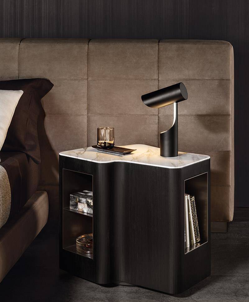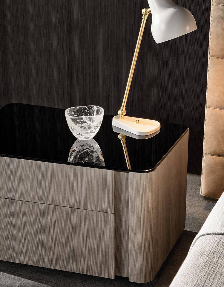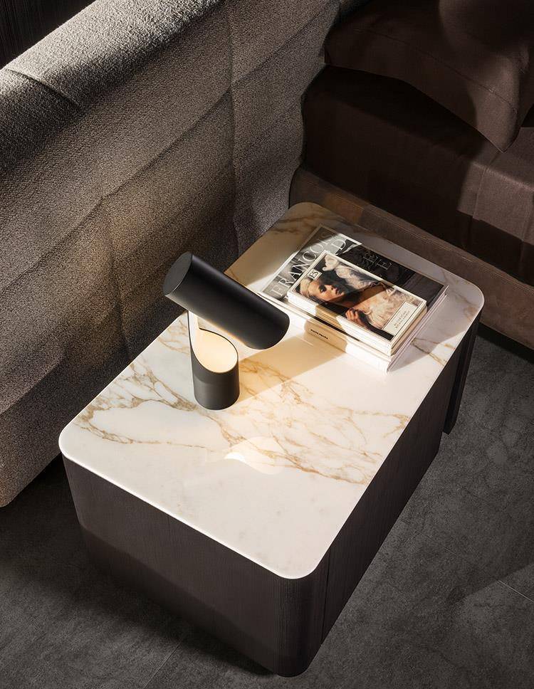The Lou collection also includes a coffee table with a swivel base in larch prefinished Dove Grey or with Licorice color lacquer finish. The top is in Calacatta marble or in black pâte de verre. The open compartments are sheathed in Bronze color satin finish metal. This coffee table fits seamlessly in the bedroom, in place of a traditional bedside table, as well as in the living room, paired with any of the seating options in the Minotti collection.