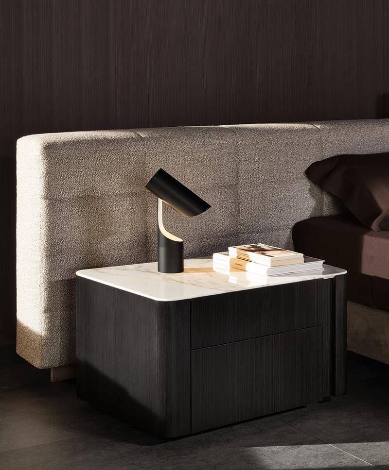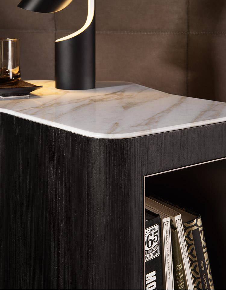 The Lou bedside table has a larch veneer structure and comes in prefinished Dove Grey or with open-pore lacquer finish in Licorice color. The flush-set tops are made of Calacatta marble and black pâte de verre. The Lou bedside table has two convenient drawers that open from the side.