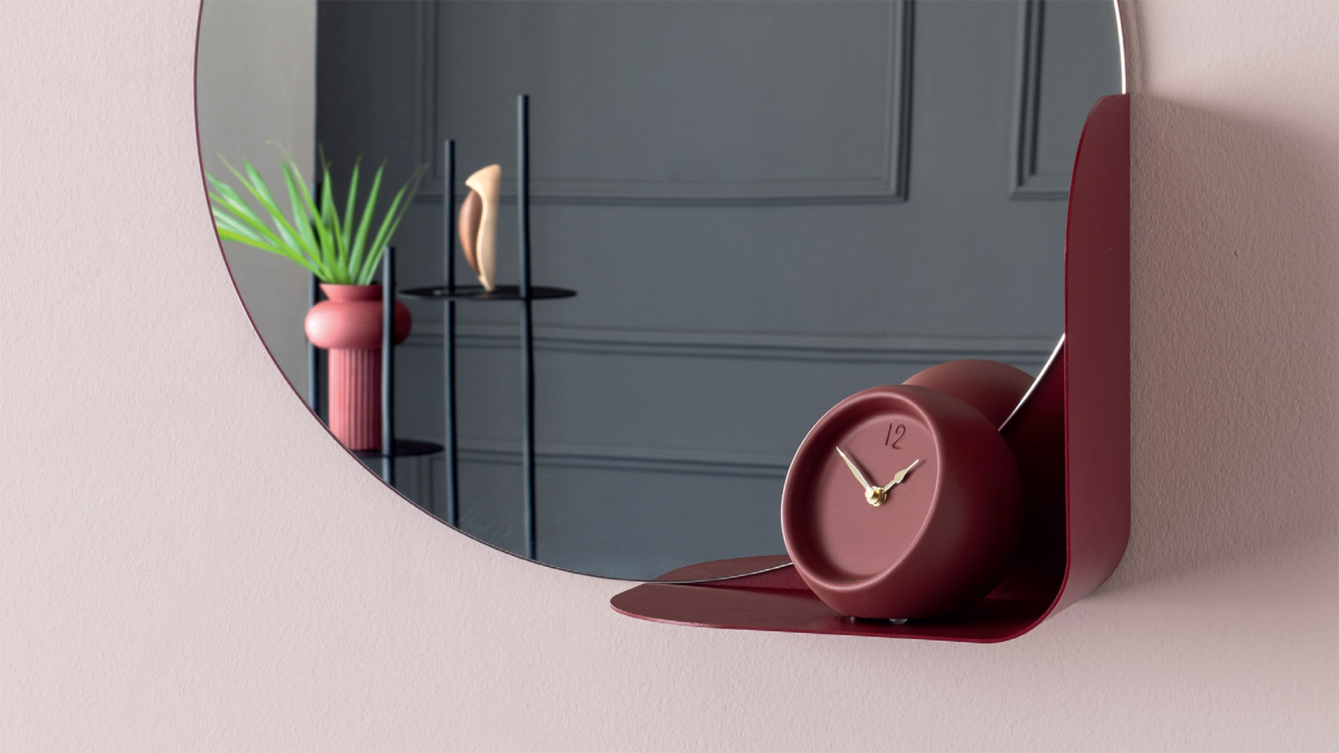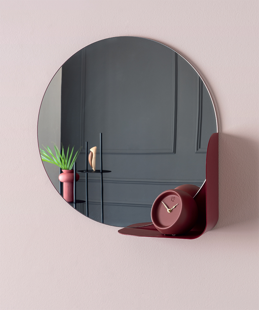 Virgola is a round mirror with a shelf in varnished metal sheet.
