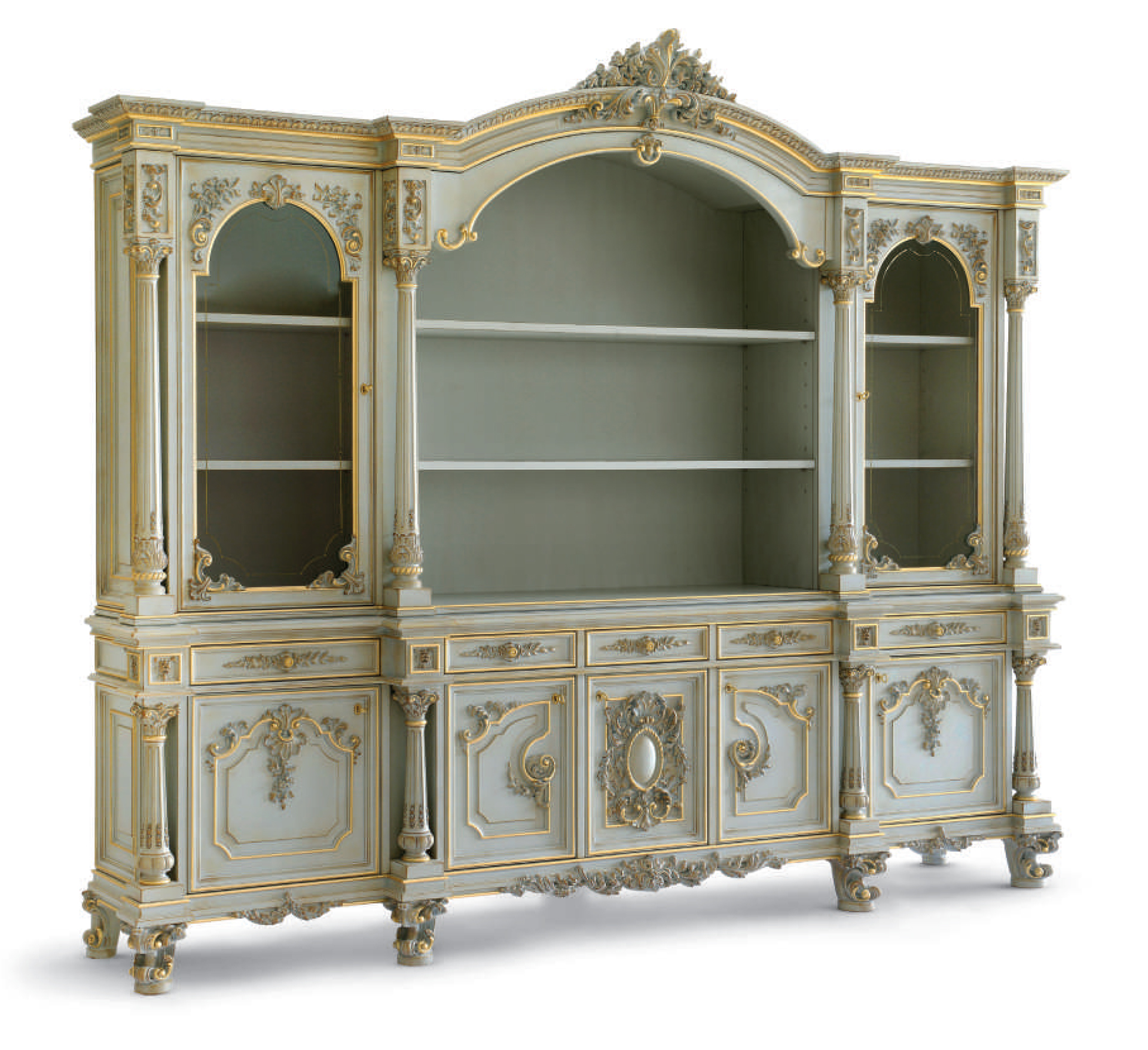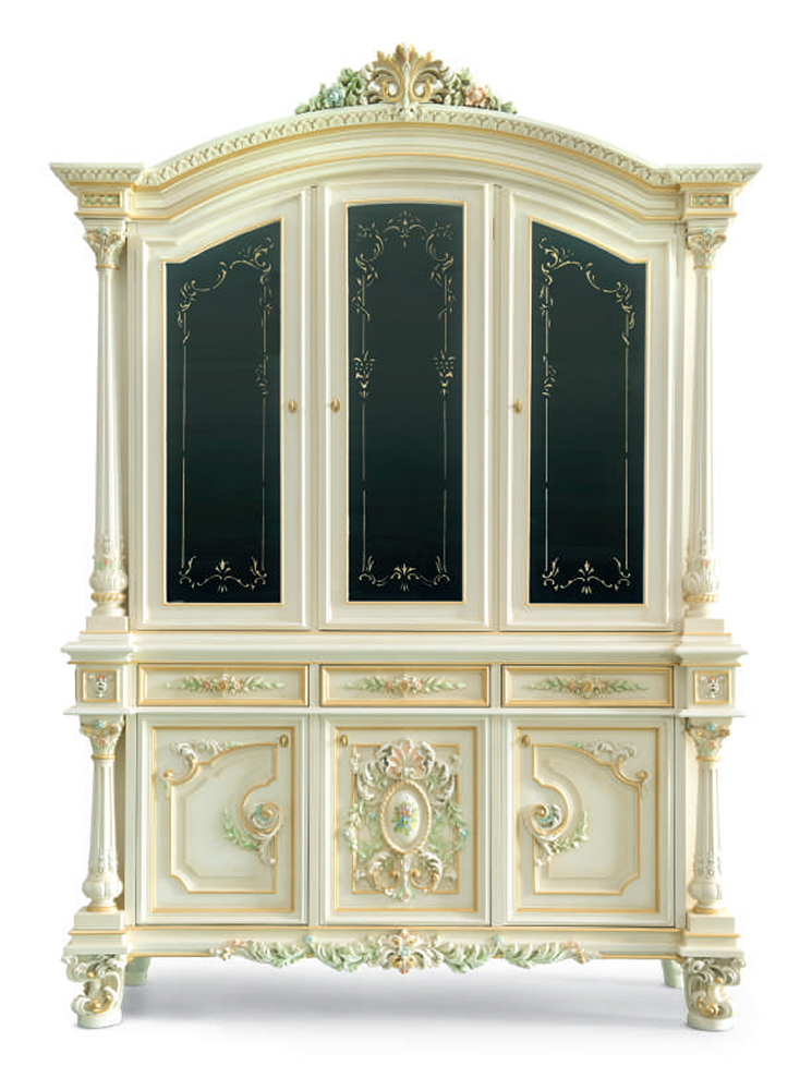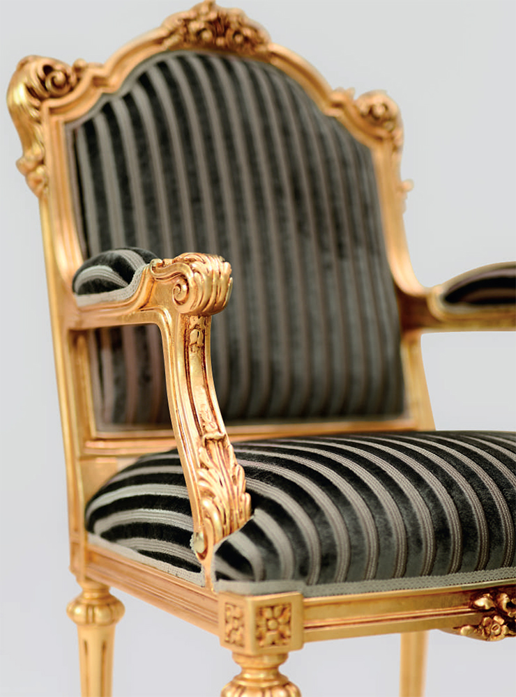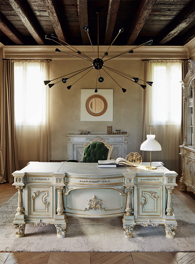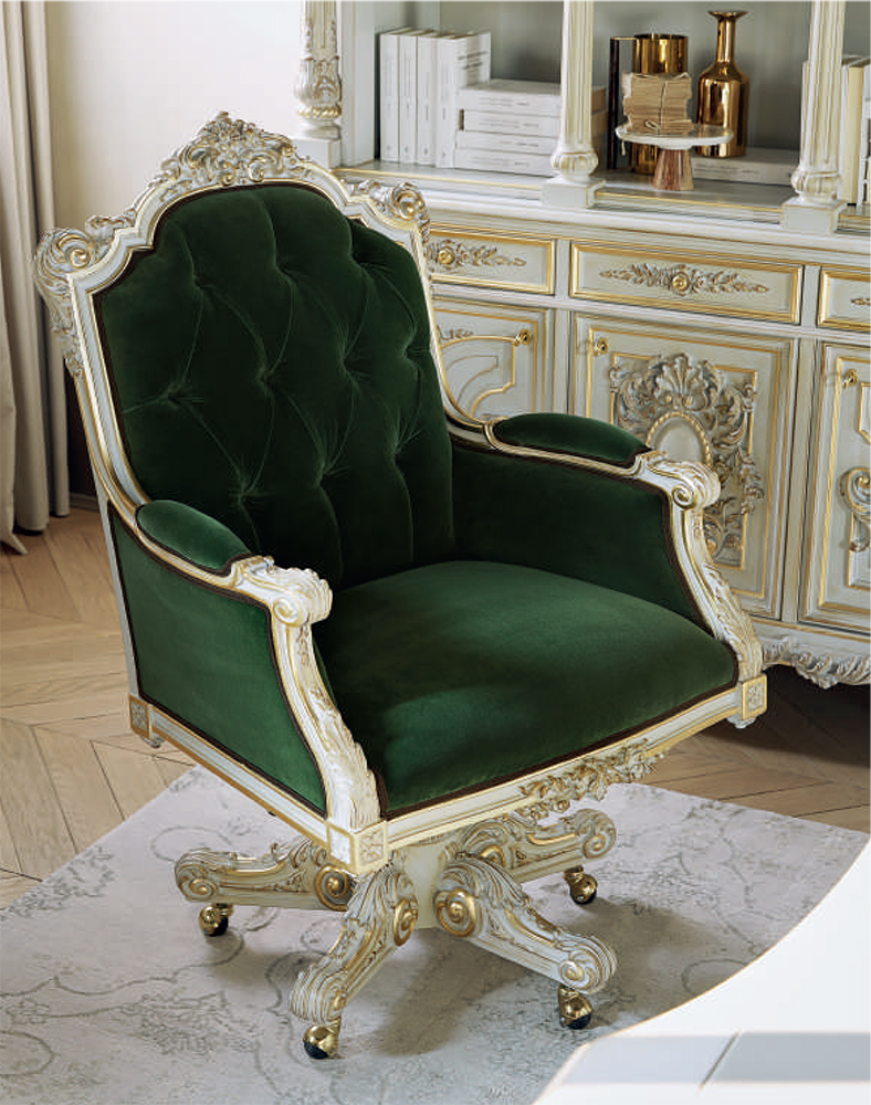 Headsets for office Giove, from the Italian manufacturer Silik. Includes a Desk, chair and bookcase . The frames are made from solid wood. Finish furniture lacquer, decoration decoration -gilding. Seat cover and cover plates on the table made of leather. The armrests are complemented with soft inserts. Decoration is the decorative thread.