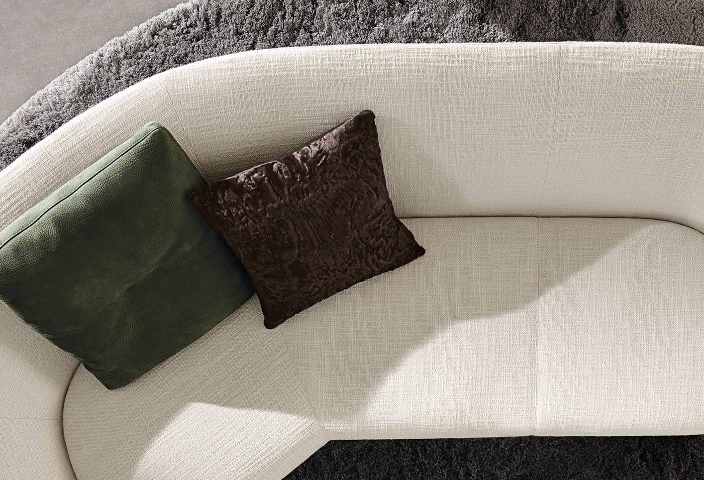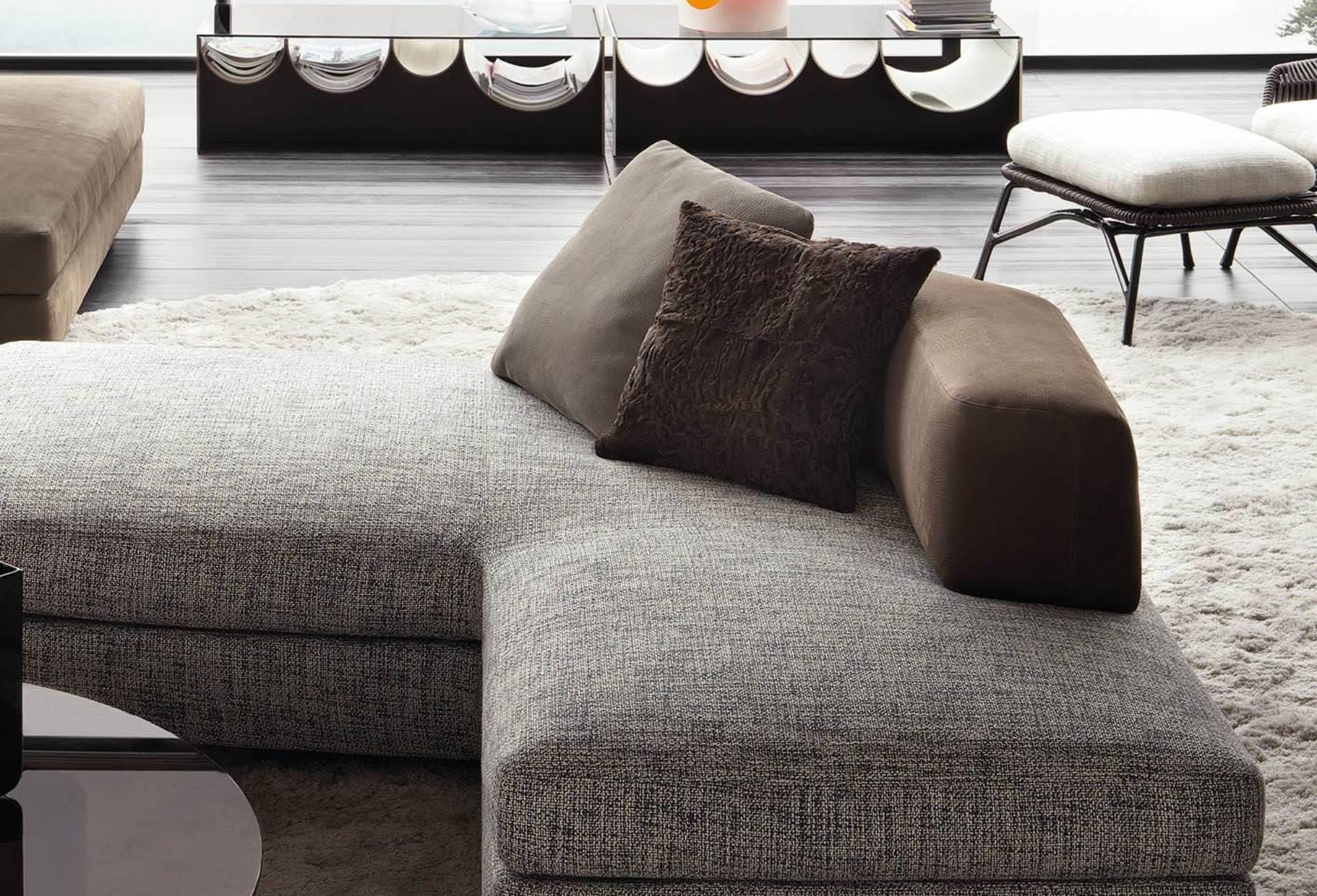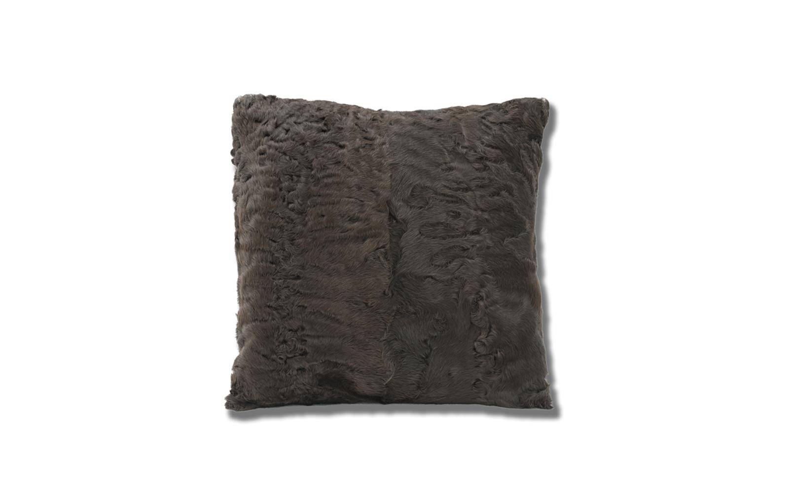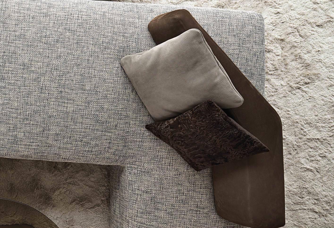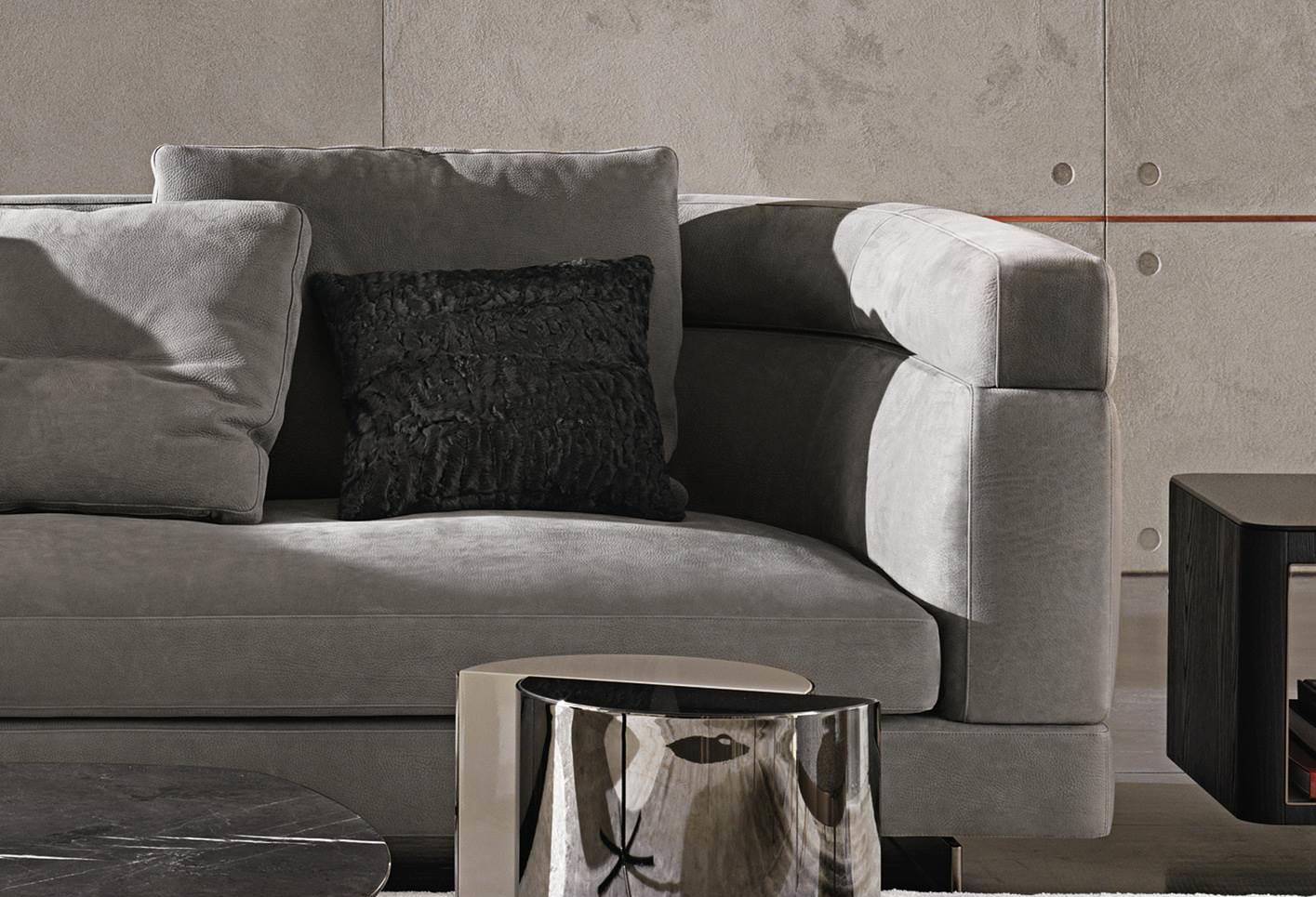 The Teddy cushion, upholstered in lambskin, is available in Dark Brown or Anthracite Grey and lends a touch of refined warmth and elegance to any seating element in the Minotti collection.