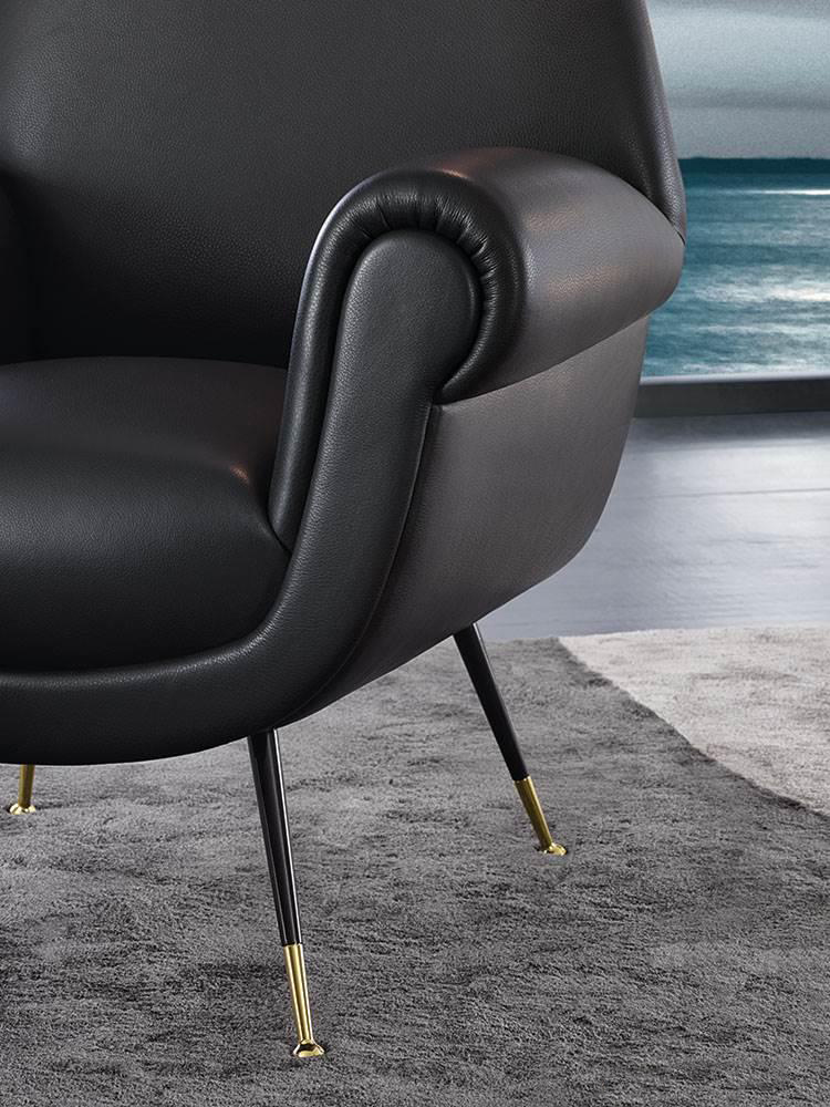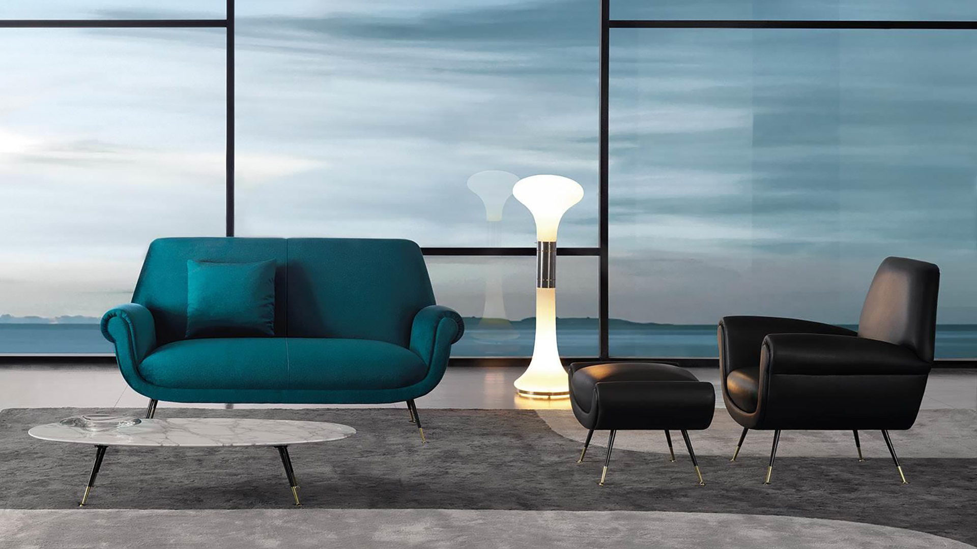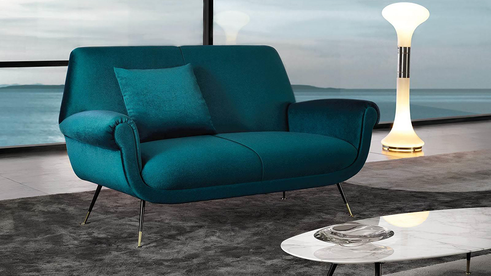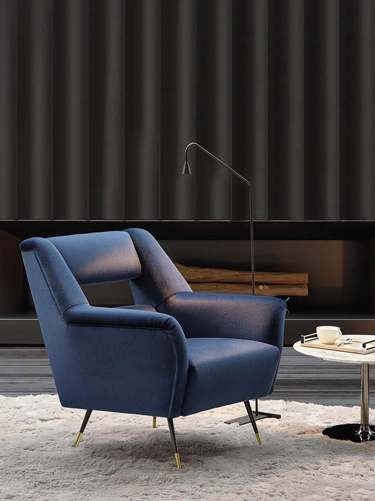 Albert maintains the 1900-inspired armrests and classic lines reinterpreted by the aesthetics of the Fifties. A decorative front element runs along its entire length and draws the armrest: made of solid wood, it is first covered and then fixed with nails to the main structure.