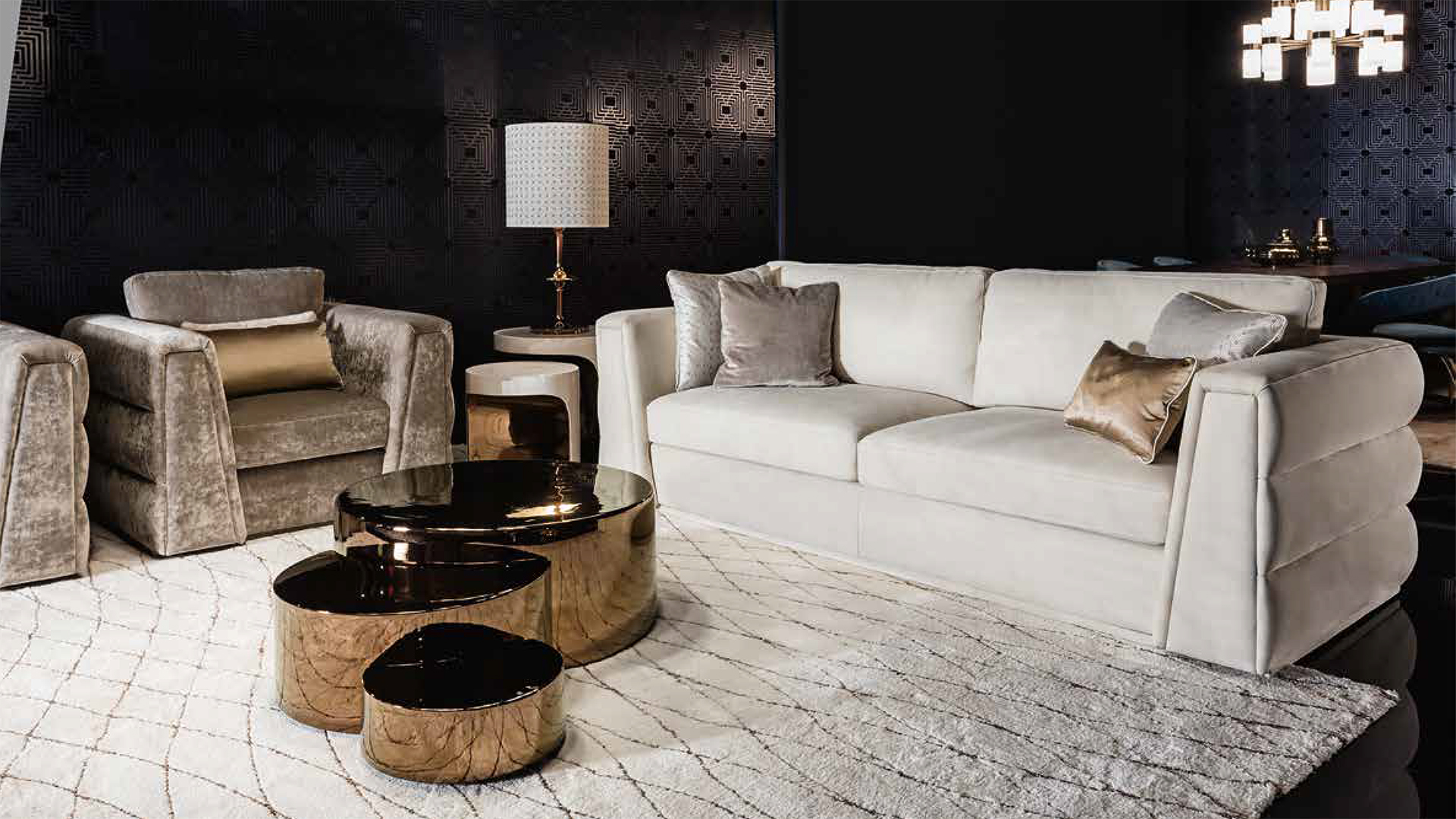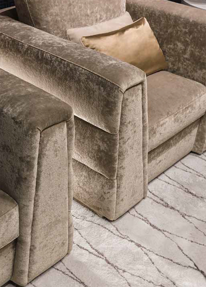 The Cloe collection features a harmonious rhythm of horizontal and diagonal lines that define essential geometric blocks. The special shape of the armrest, which widens at the base, reveals a bold personality.