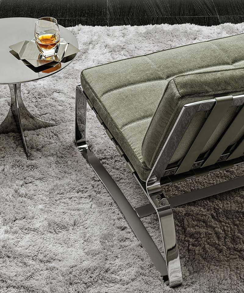 Delaunay Quilt, with its chrome finished frame and leather upholstery in colours that open new horizons, effortlessly blends in with the Seventies spirit that guides the 2019 Collection.