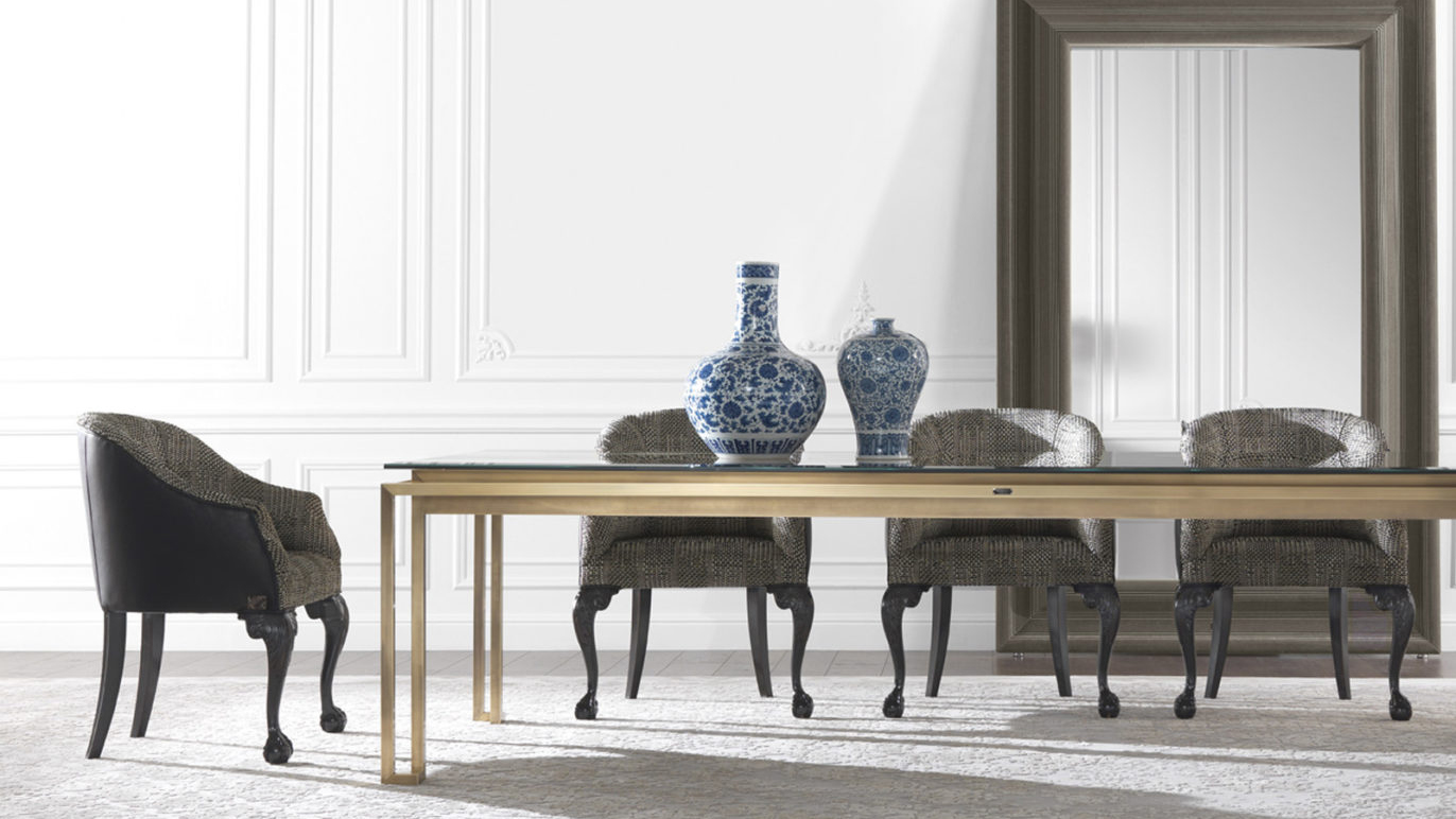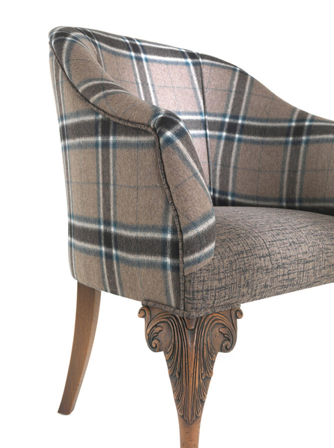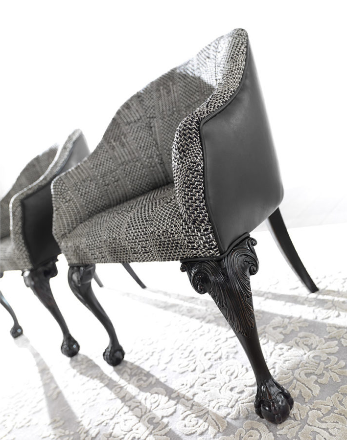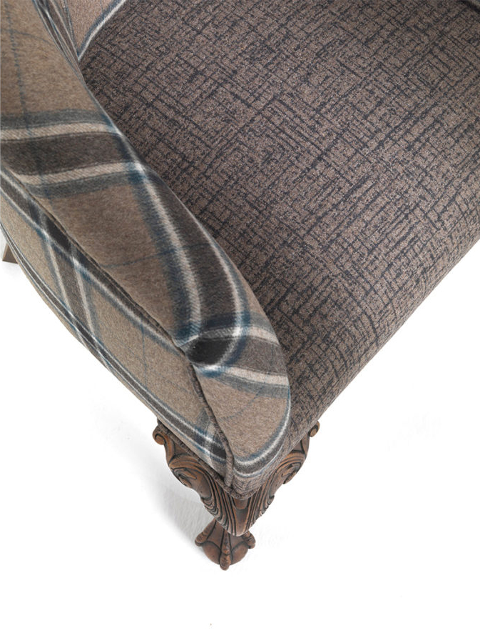 A mix of classic and contemporary for the Edward armchair. Proposed with a new finish in waxed mahogany, it has front legs with lion paw feet and back legs with saber shape, while seat and back can be covered with different male fabrics of the collection, creating original combinations with an irresistible British charm.