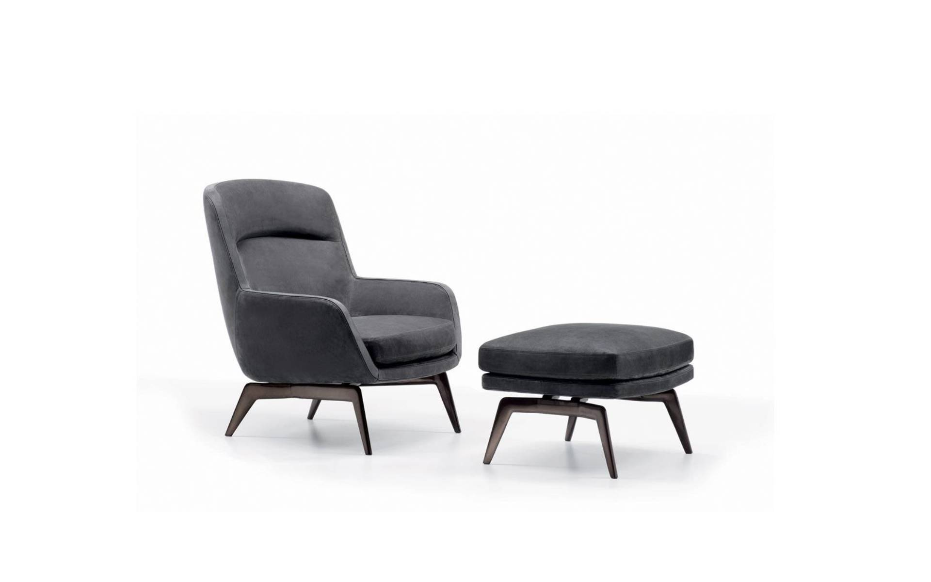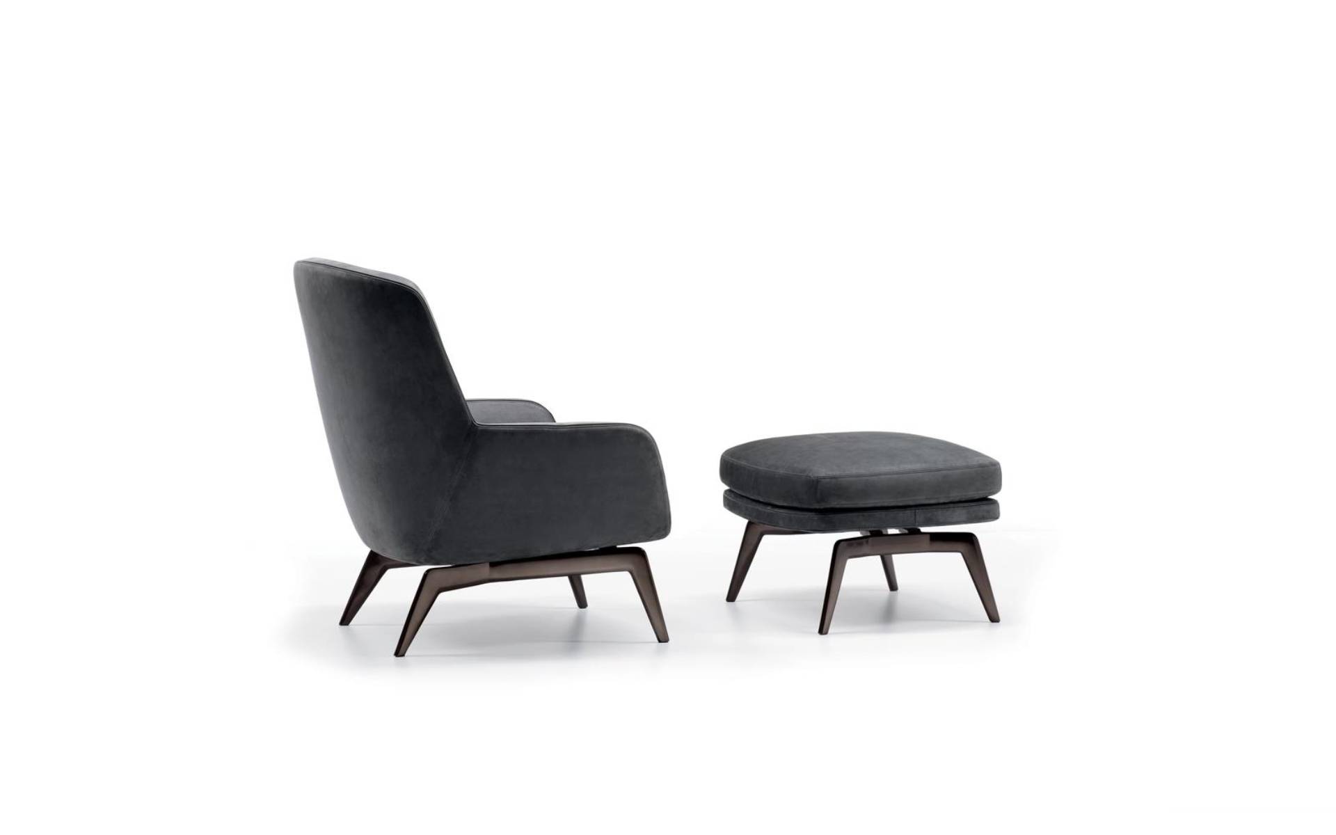 The family consists of a sofa, an armchair, a bergère with footstool, a smaller lounge armchair, and a dining little armchair also available with legs in Dark Brown stained Canaletto walnut or lacquered open-pore Black ash.