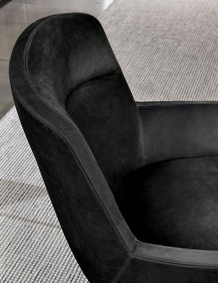 The seat rests on a die-cast aluminium base with a polished Brandy-coloured anti-touch varnished finish, which enhances the armchair and, in its leather version, recalls the metal finishes of exquisite leather bags.