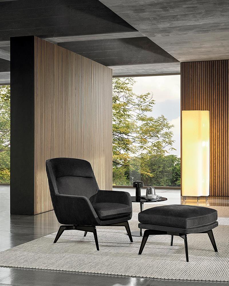 The family consists of a sofa, an armchair, a bergère with footstool, a smaller lounge armchair, and a dining little armchair also available with legs in Dark Brown stained Canaletto walnut or lacquered open-pore Black ash.