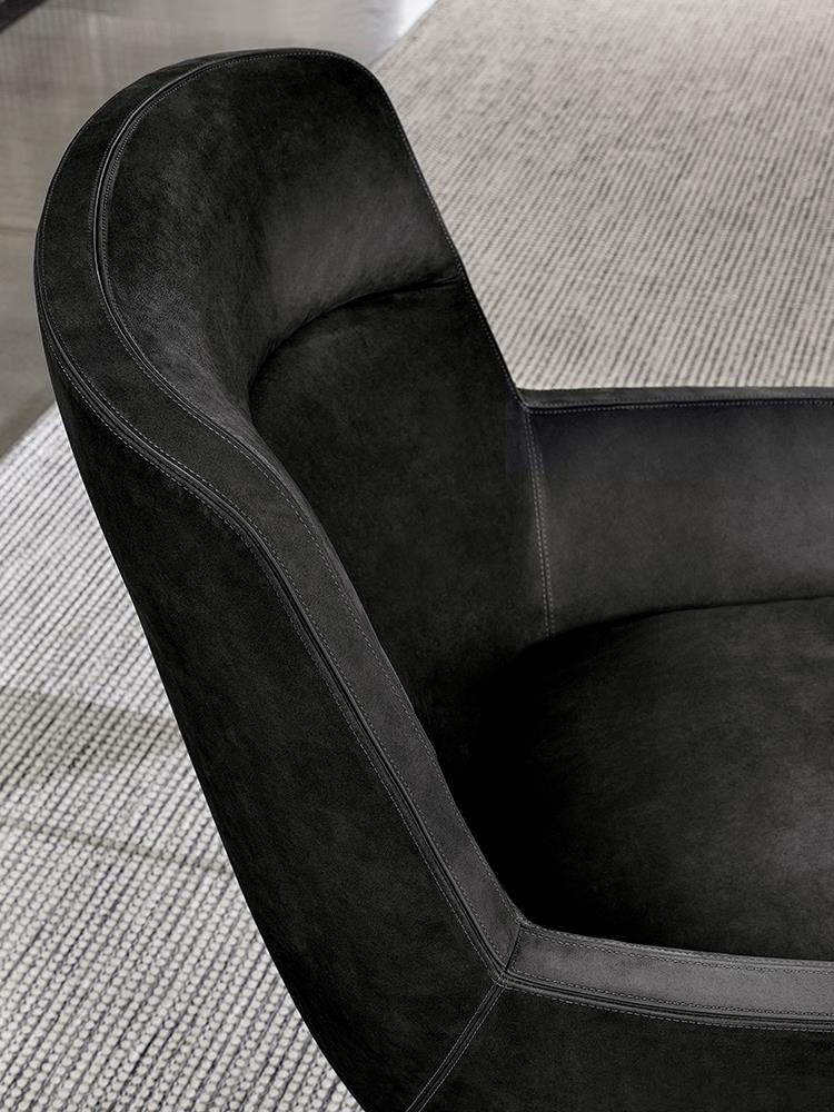 With its classic shape, the foam body designs a shell-like, enveloping backrest that welcomes and protects. The seat rests on a die-cast aluminium base with a polished Brandy-coloured anti-touch varnished finish, which enhances the armchair and, in its leather version, recalls the metal finishes of exquisite leather bags.