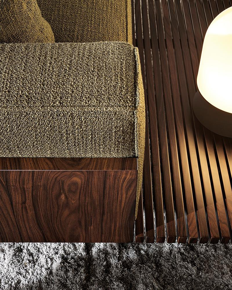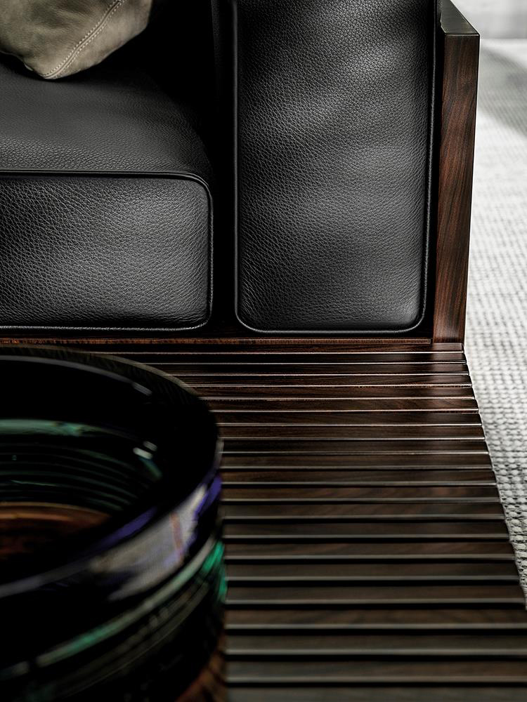 The family hosts a range of seats for different environments, from the living to the night area, including sofas, elements with one armrest, an armchair and ottoman, and a varied selection for the bedroom. It is characterized by a Mid-Century aesthetic revisited and modernized not only in its lines and volumes, but also in its use of materials, in particular Dark Brown stained palisander Santos, and in its elegant structural details.