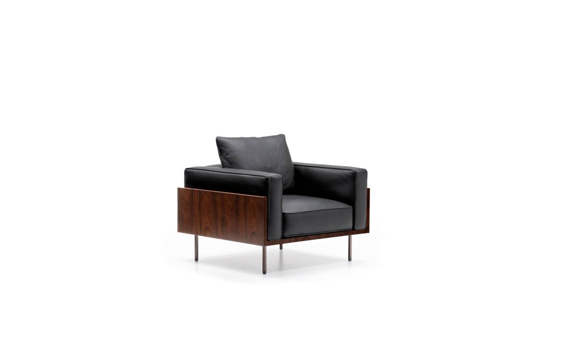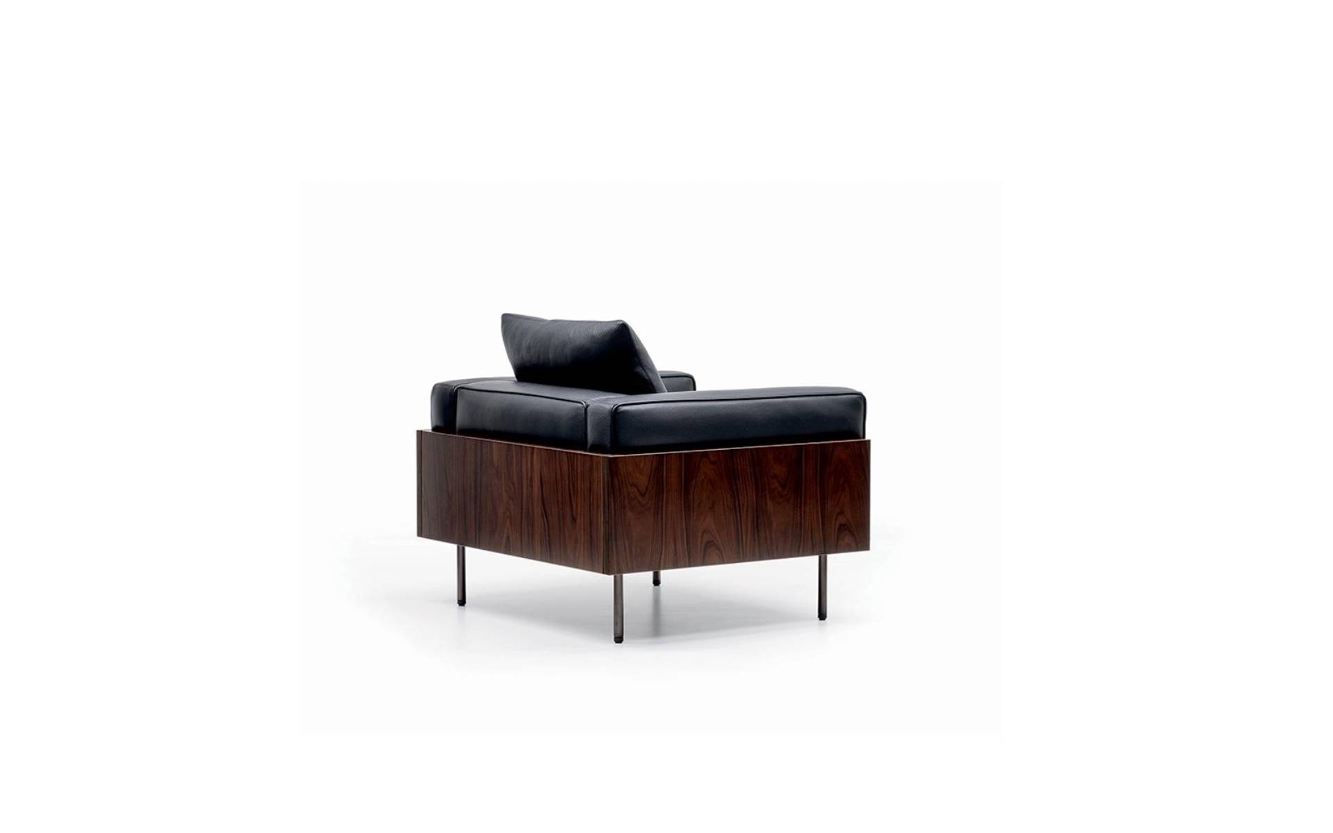 The family hosts a range of seats for different environments, from the living to the night area, including sofas, elements with one armrest, an armchair and ottoman, and a varied selection for the bedroom. It is characterised by a Mid-Century aesthetic revisited and modernised not only in its lines and volumes, but also in its use of materials, in particular Dark Brown stained palisander Santos, and in its elegant structural details.