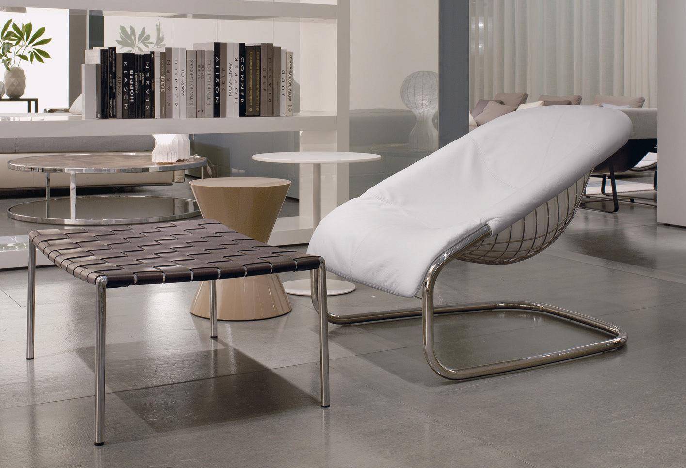 Its lightweight metal structure, which seems to defy the force of gravity, makes for a considerably more versatile use, in a variety of combinations with all the sofas from the Minotti collection.