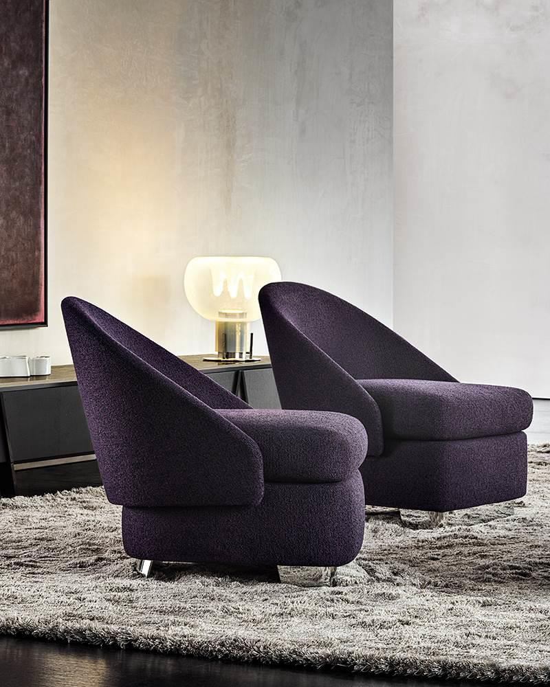 Each piece can be used in a wide range of potential combinations of materials and colours. And while the impression made by Lawson oozes with Seventies style if the arrangement includes pieces with black leather, structured fabric upholstering and feet with a chrome finish, instead, a more decorative spirit shines through if the option chosen features velvet and chenille.