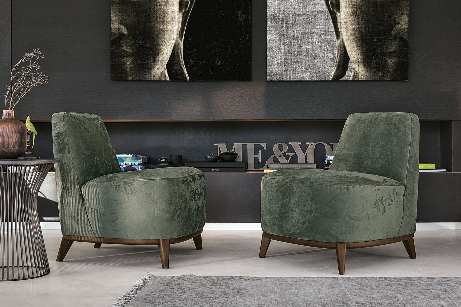 Loft is an armchair with compact dimensions that conquers with its soft lines and its retro-inspired design, enhanced by the oblique wooden feet! Simple and versatile, the seat can be combined with the armchair and sofa of the homonymous collection!