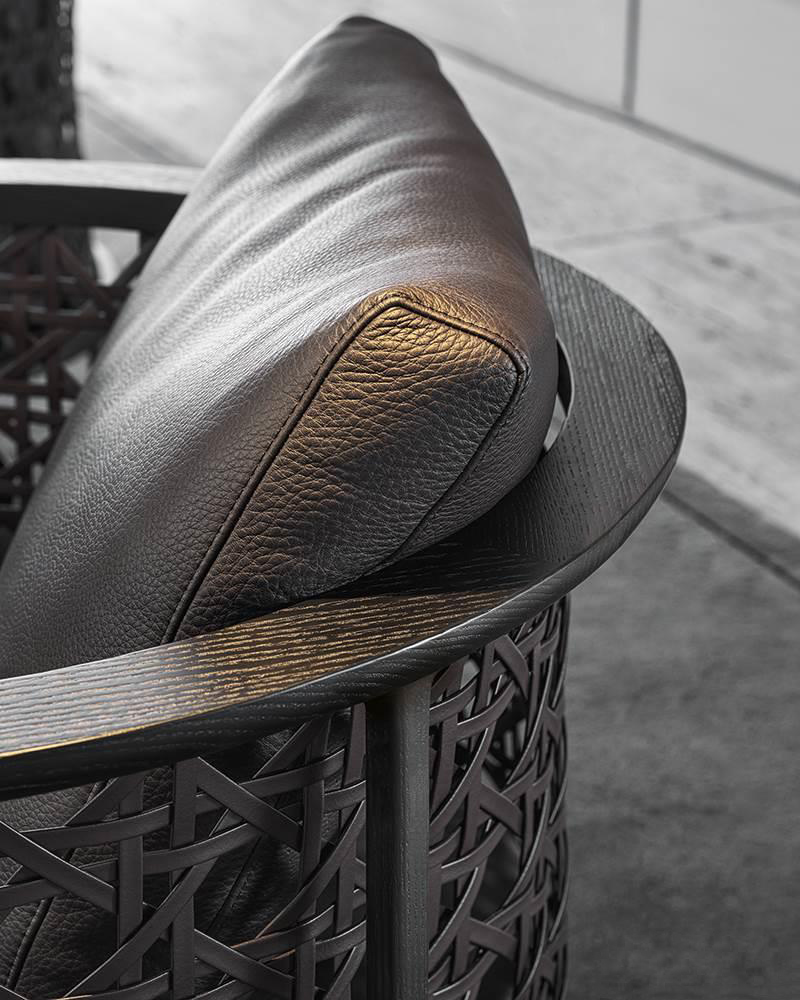 The seats can be accessorized with leather magazine caddy, crafted with fine luggage-crafting techniques and enriched with the same metal details as the base. The end of the horizontal metal element of the legs is designed so that it almost holds the backrest and seat, recalling the Kigumi technique, borrowed from the Japanese tradition of wood construction. A small decorative disk with Black-Nickel finish, in the form of a jewel-like button located at the end, adds a precious detail to the ensemble, and creates a series of contrasts with the Bronze colour varnished metal finish of the legs.