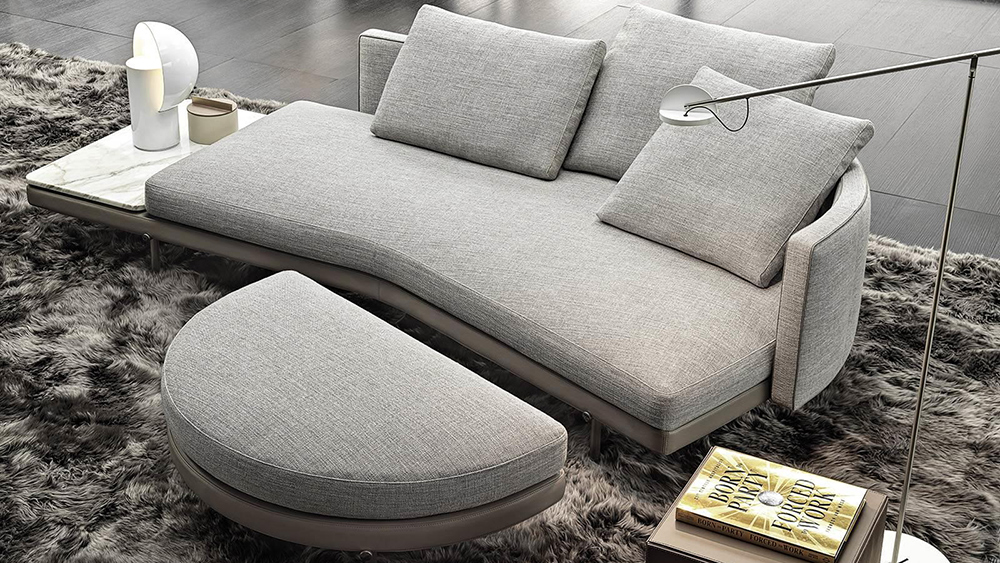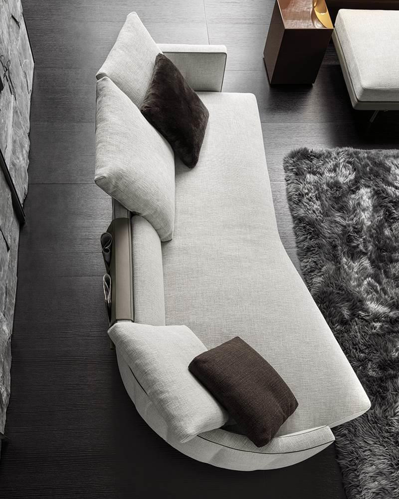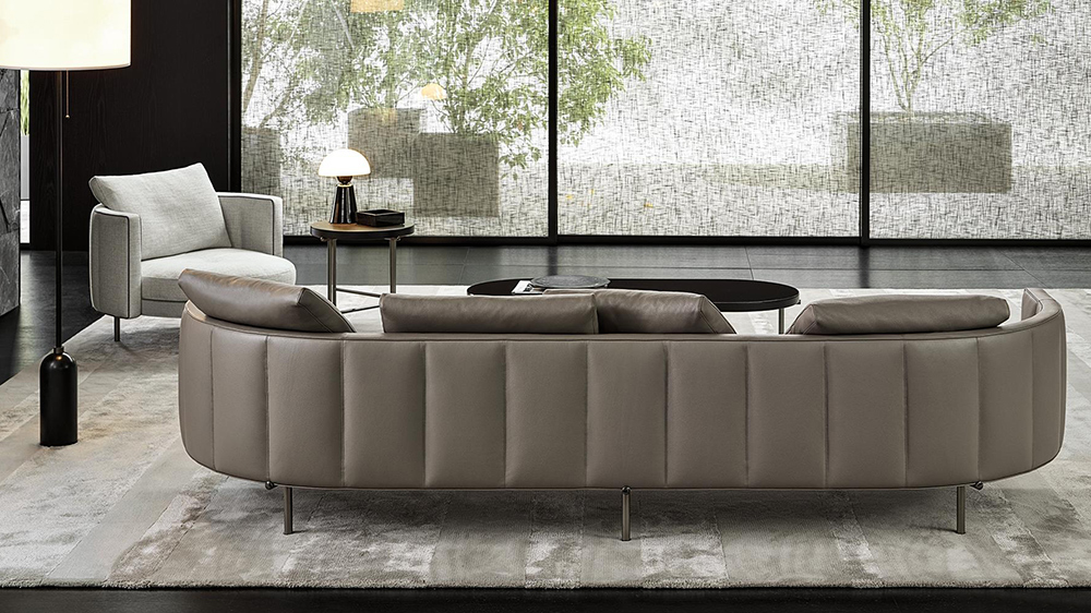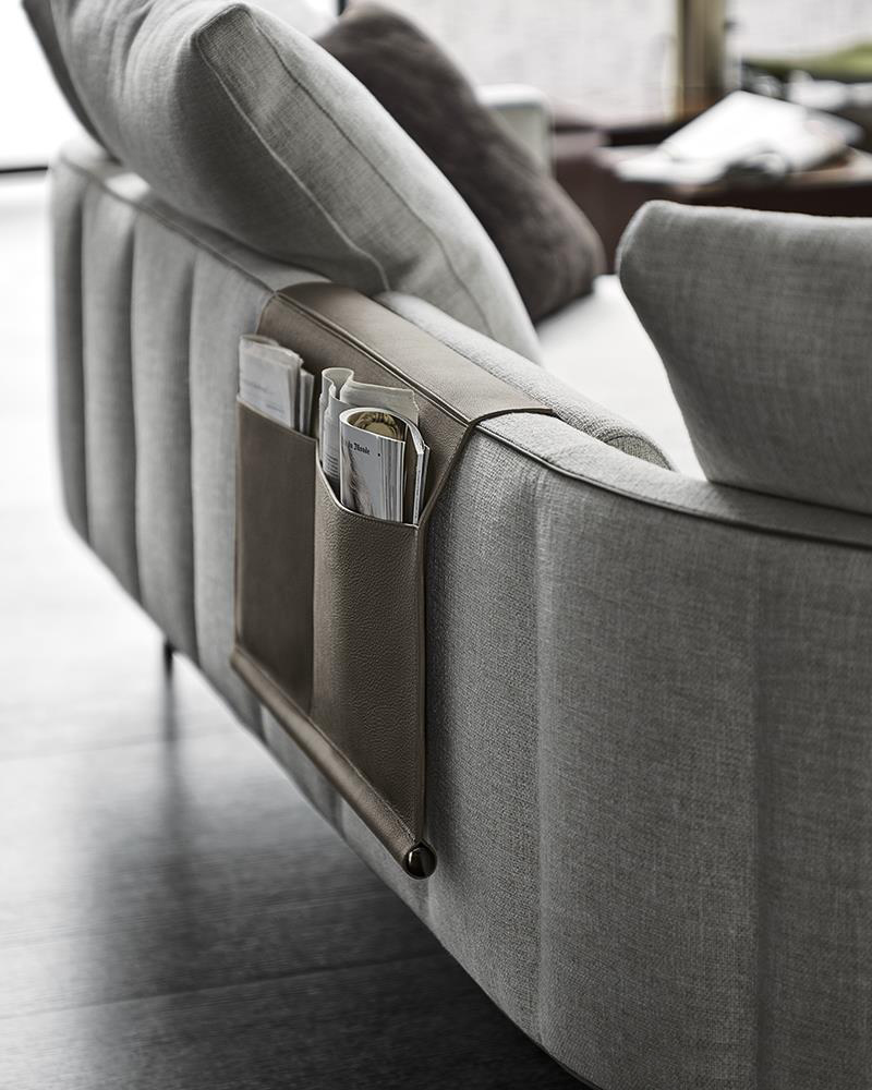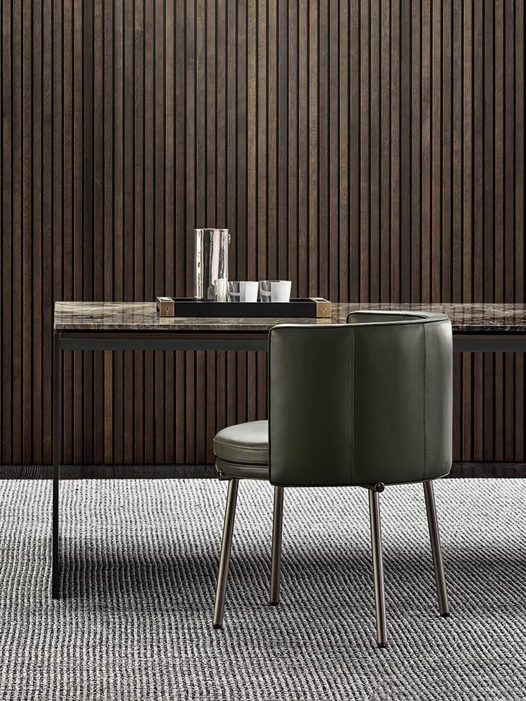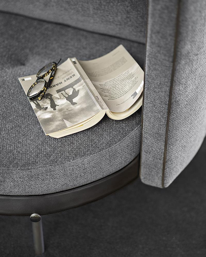 The slim backrest features vertical quilting and a piping running along the perimeter of the cushioning, underlining the couture quality of the craftsmanship. The eco-leather and eco-nubuck piping is in a slightly contrasting colour, but in the same shade as the fabric, if combined with a textile covering, whereas the leather versions come in the same shade when combined with leather upholstery. All the upholstered elements of the system can be customized by choosing the covering: 100% fabric or leather, or in fabric with a leather base.
