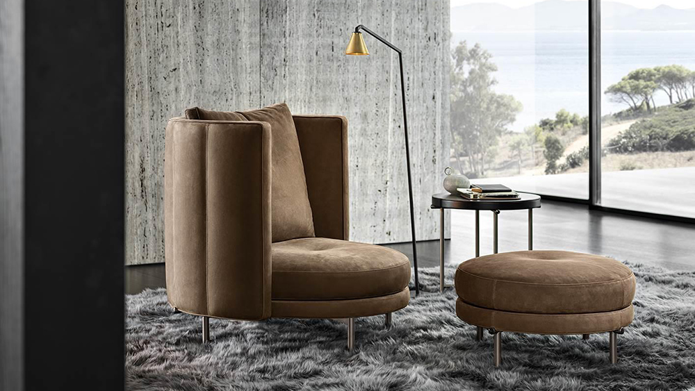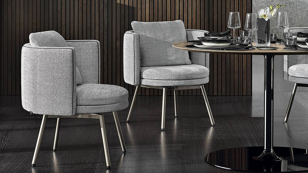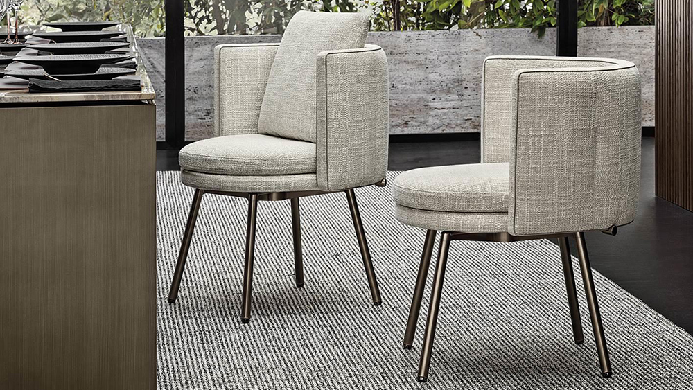The armchairs and swivel armchairs in the form of a perfect circle were designed to meet a variety of requirements, both in terms of functionality and ergonomics, available in a range of different types. The seats - in the Bergère, Large, Medium and Small versions - and the Dining, Dining Large and Lounge little armchairs are the result of the in-depth research carried out to find the best way to express the sophisticated simplicity of the craftsmanship. The base is available in leather or fabric.