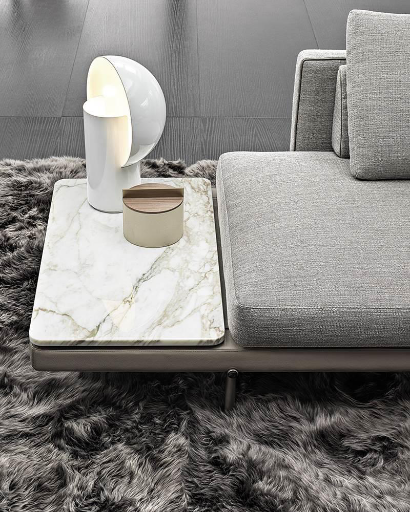 The extension of the base of some elements features a top in Calacatta or Stone Grey marble with a matt polyester lacquer finish, crafted with a careful study of its proportions, thickness and structural details so that it blends seamlessly into the seat, also from an aesthetic point of view.