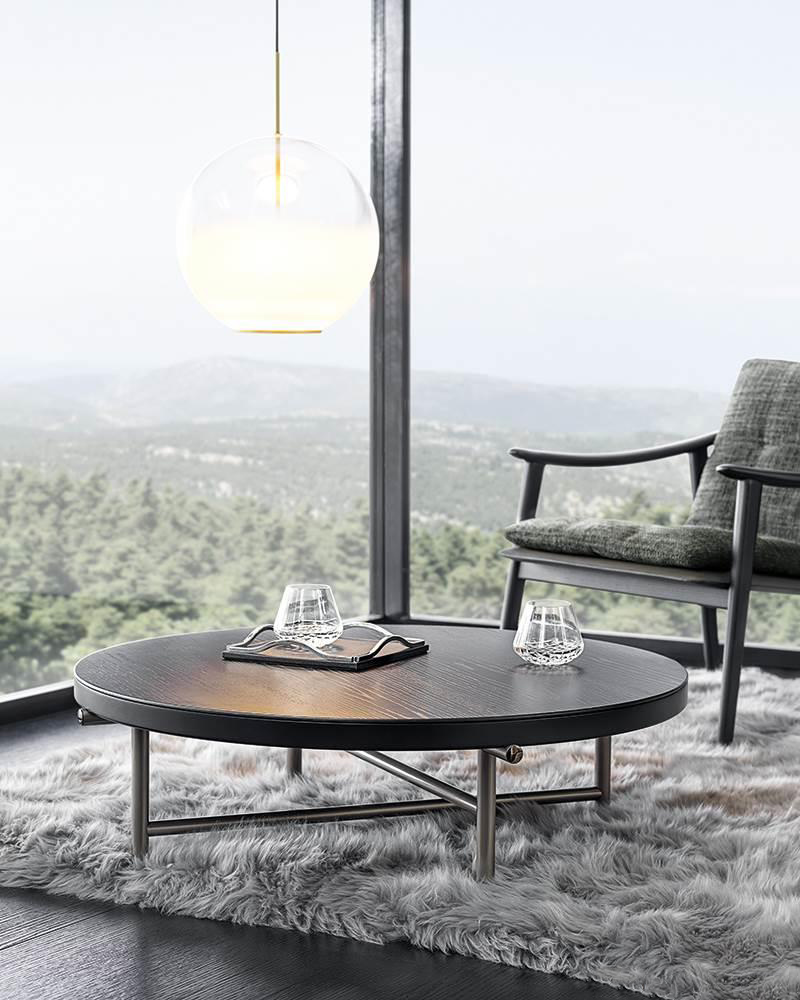 The Torii coffee tables also feature the same structural style details as the seats, reflected in the metal frame with Bronze colour varnished finish and details in Black-Nickel metal. Available in different sizes, ranging up to an impressive diameter of 120 cm, and different heights, they feature a top in Calacatta or Stone Grey marble with matt polyester finish, in Black pâte de verre or in Liquorice colour brushed ash wood, enclosed by a Liquorice colour matt lacquered frame.