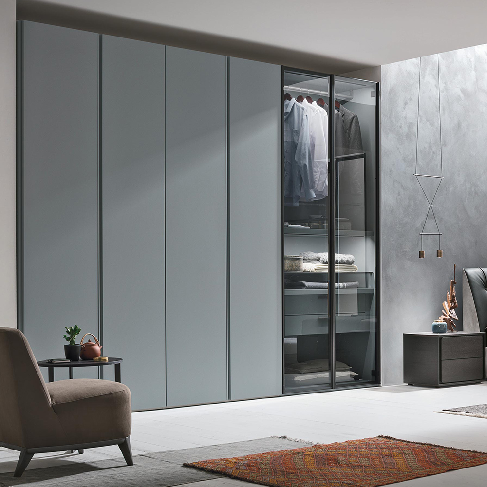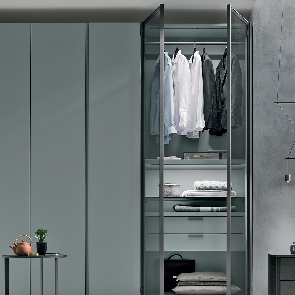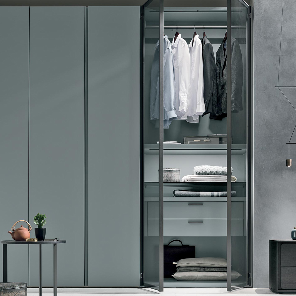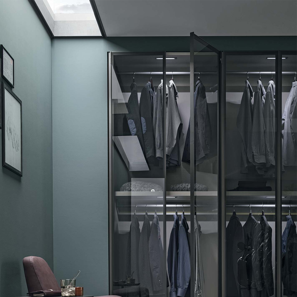 Metropolis со стеклянной створкой в раме антрацитовой расцветки предлагает новую трактовку классического шкафа, который предназначается для того, чтобы «прятать» одежду и вещи, но при этом наглядно демонстрирует яркий стиль. Это очень трендовая модель.