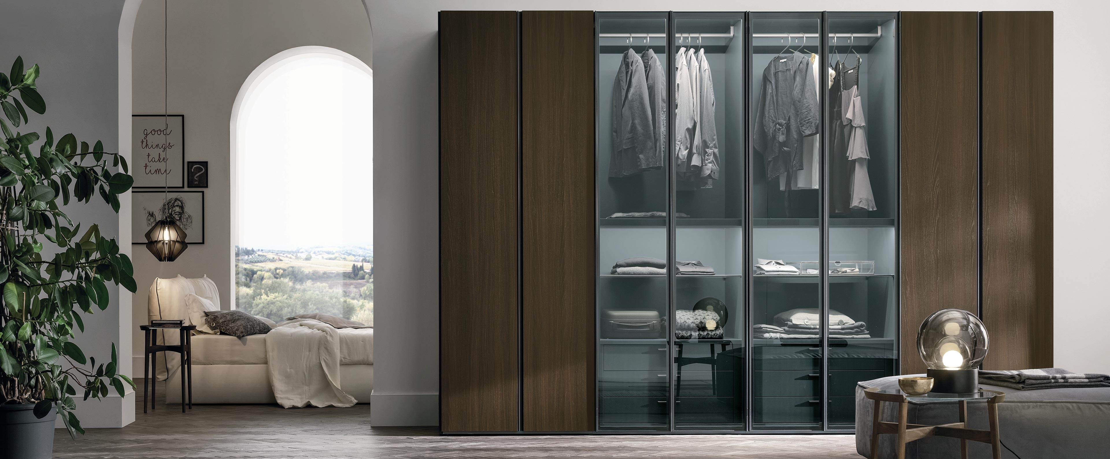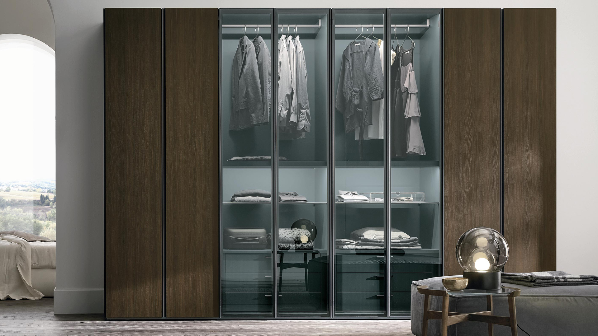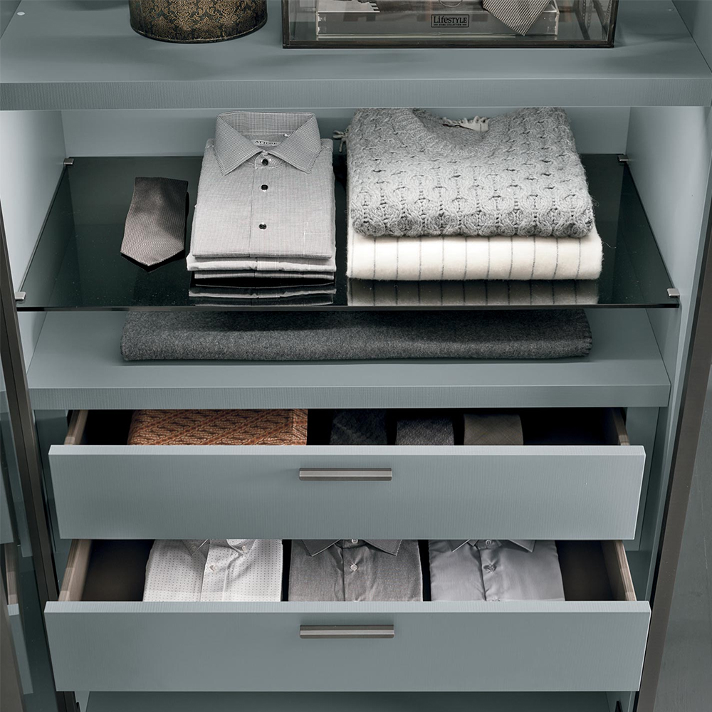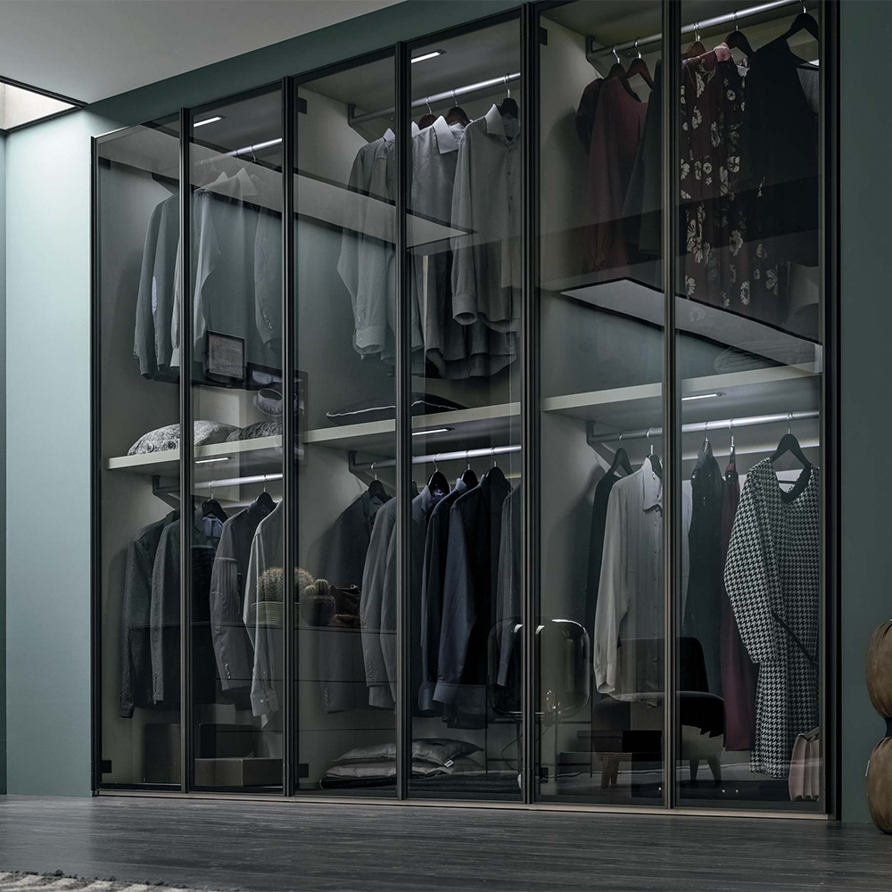 Metropolis со стеклянной створкой в раме антрацитовой расцветки предлагает новую трактовку классического шкафа, который предназначается для того, чтобы «прятать» одежду и вещи, но при этом наглядно демонстрирует яркий стиль. Это очень трендовая модель.