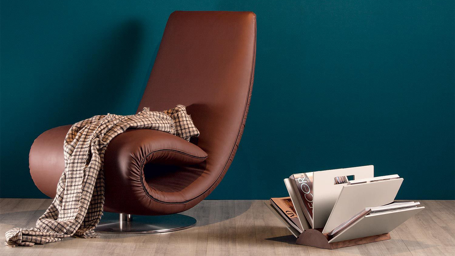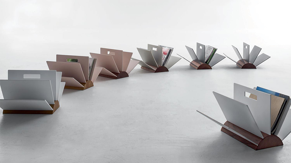 Сегментные, лакированные панели раскрываются на элегантном основании; элемент из массива дерева. Его пространство предназначено для хранения книг и журналов, и оно принимает другую — инновационную форму, играя с линиями и цветами, пустых и заполненных пространств.