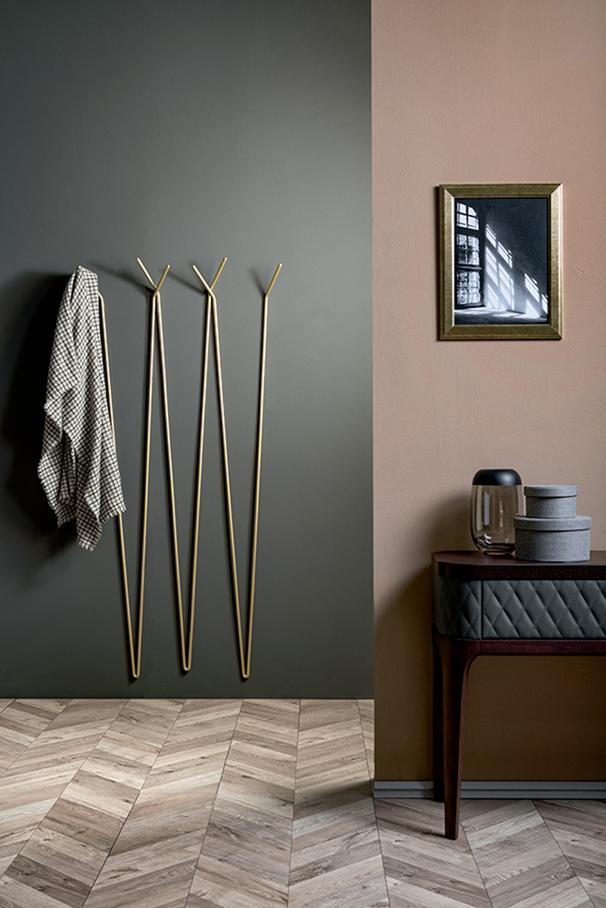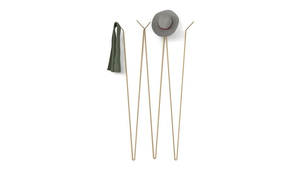 Вешалка из лакированной металлической проволоки с минималистичным и функциональным дизайном. Доступен в матовом золотом лаке, угольно-сером и каменно-бронзовом вариантах.